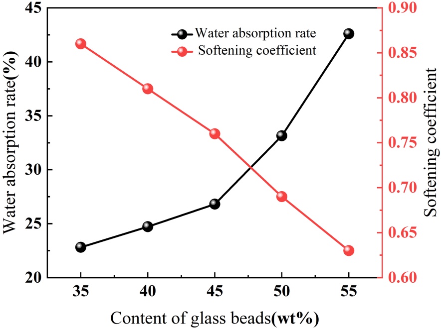 Figure 9. The influence of glass microsphere content on the water absorption rate and softening coefficient