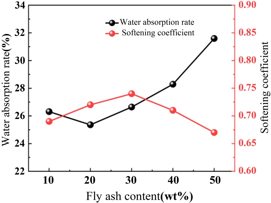 Figure 10. The influence of fly ash content on the water absorption rate and softening coefficient
