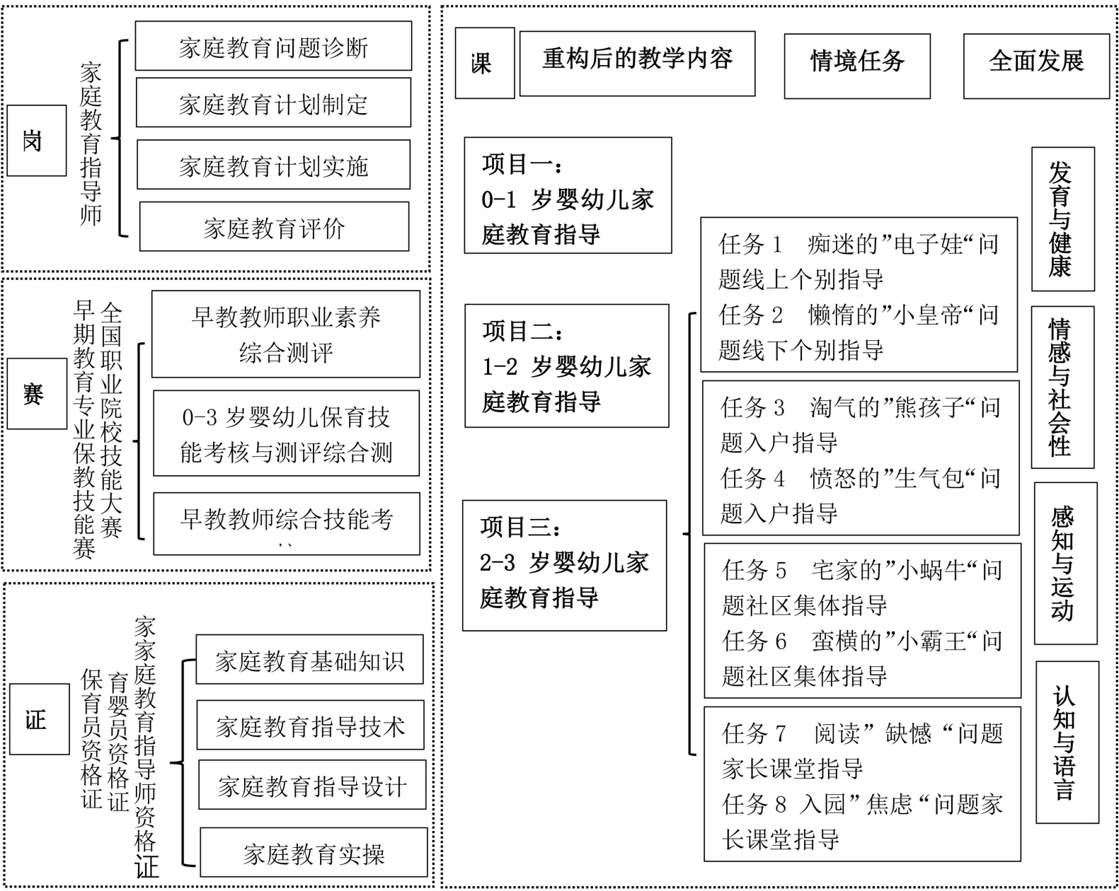 以婴幼儿家庭教养指导与咨询课程为例,首先内容上实现“岗赛证”对接;进而以家庭为本位,遵循婴幼儿的发育与健康、情感与社会、感知与运动、认知与语言的全面发展理念,根据其身心发展的阶段性任务,重构课程内容;聚焦家庭典型育儿问题,创设具体任务情境;最后,根据家庭教育指导师典型工作任务“职业技能——诊断、咨询与指导”,结合人才培养方案和课程标准,以发展学生婴幼儿家庭教育指导的综合能力为目标,确定多样化的课程实践形式,如图1。