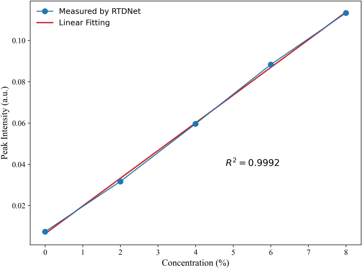 通过对实验测得的五组信号使用RTDNet进行降噪处理后,对二次谐波信号峰值与气体浓度进行线性拟合,拟合结果如图7所示。线性关系表示为