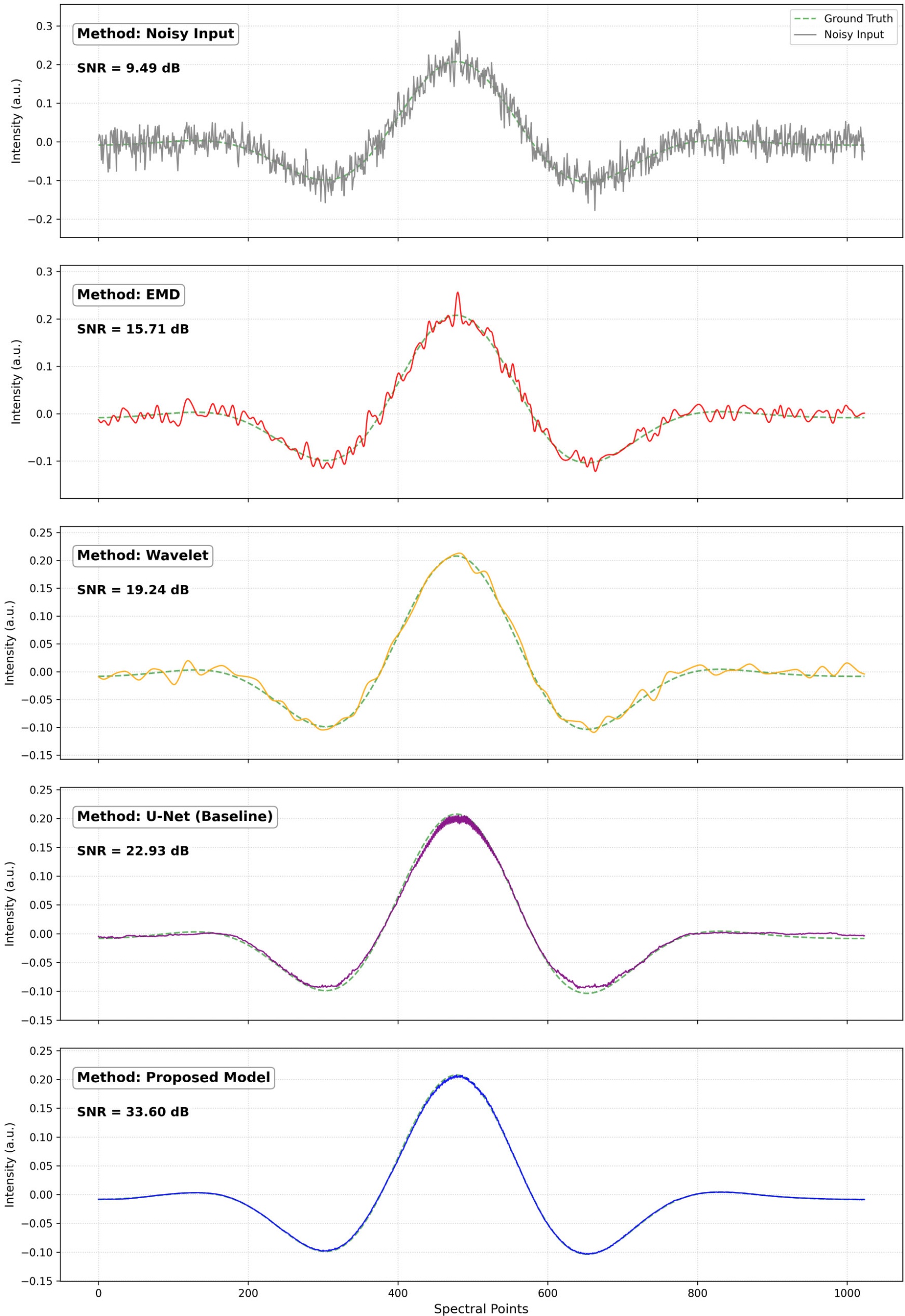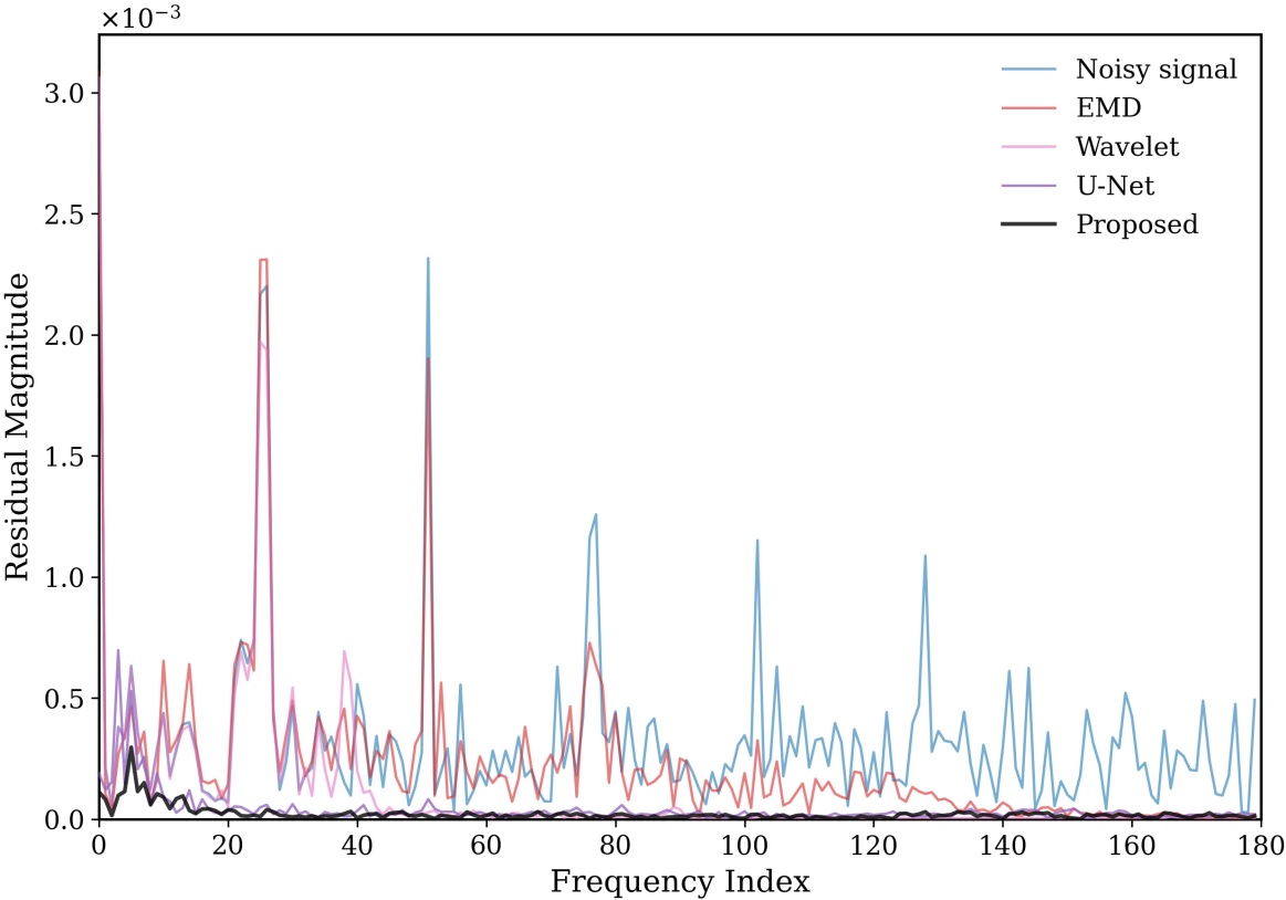 从频率角度仔细分析几种方法的去噪能力,对每种方法处理过的二次谐波光谱做傅里叶变换,对比如图5所示,原始含噪输入信号(蓝线)在整个频段内都呈现出了高幅值的随机分布,特别在低频区有多个显著的尖峰。EMD方法(红线)虽然降低了一定的噪声水平,但在低频段仍残留大量高幅值的噪声尖峰,说明其在处理复杂低频噪声成分时能力有限。Wavelet (粉线)展现出在高频去噪的优势,然而在极低频段去噪能力依然很难让人满意。U-Net在高频段表现尚可,但在极低频段其残差幅值甚至超过EMD方法,显示出模型在捕捉长程依赖和分离低频噪声方面的不足。相比之下,RTDNet (黑线)即使在前几种方法表现最差的低频区间也能成功将残差幅值压制在极低的水平。最终,图5再次证明了RTDNet在全频段的降噪能力。