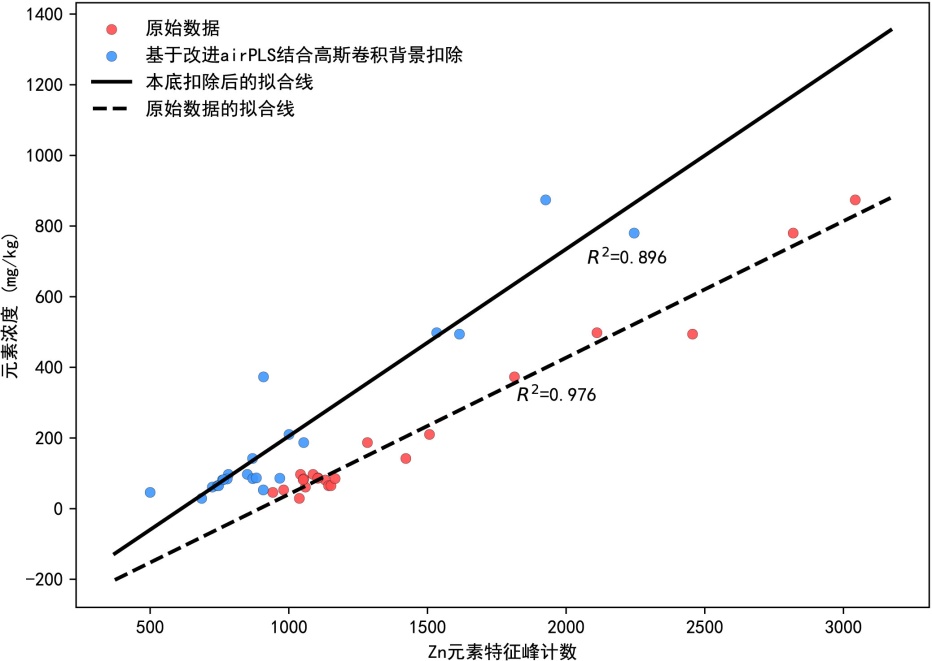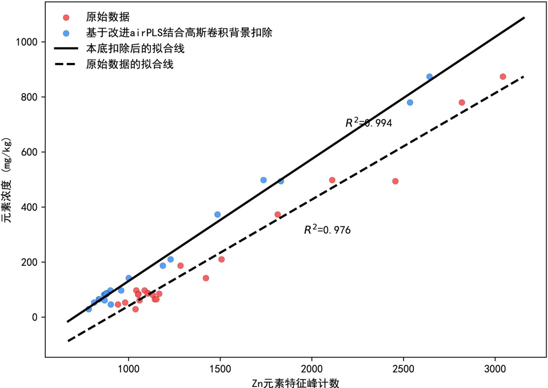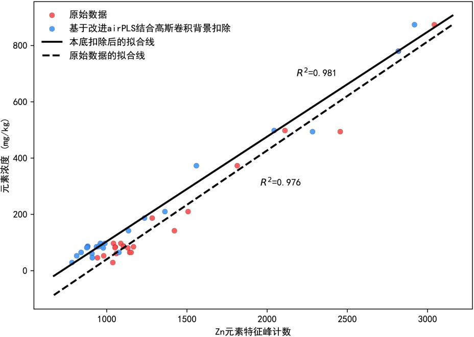 由于本底的存在会在一定程度上干扰净峰面积(特征峰计数)与元素浓度的正相关关系,干扰程度会因元素差异而不同,为了证明本底信号能够被精准扣除、同时保留完整的峰信息,可以利用这种线性关系来表现背景估计算法的准确性。本研究以重金属Zn (