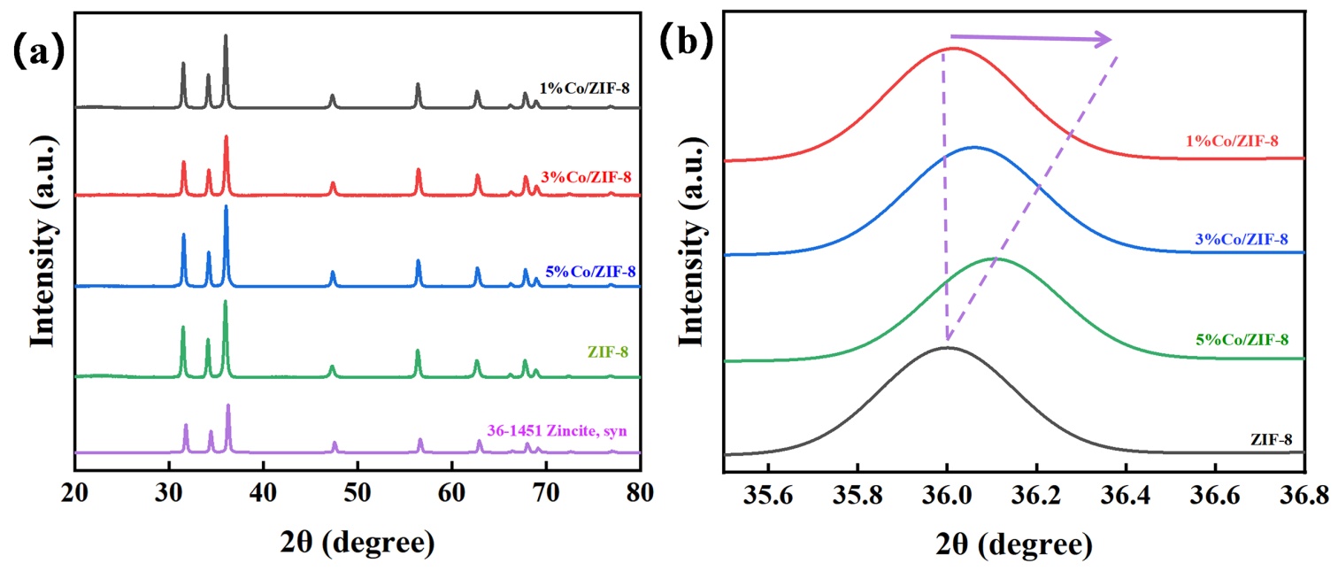 Figure 1. (a) XRD patterns of ZIF-8 and Co-doped ZIF-8 with different Co contents (1%, 3%, and 5%), compared with the standard reference (PDF No. 36-1451); (b) Enlarged view of the characteristic peak around 2θ ≈ 36˚, showing a peak shift with Co content, indicating lattice modulation induced by Co doping