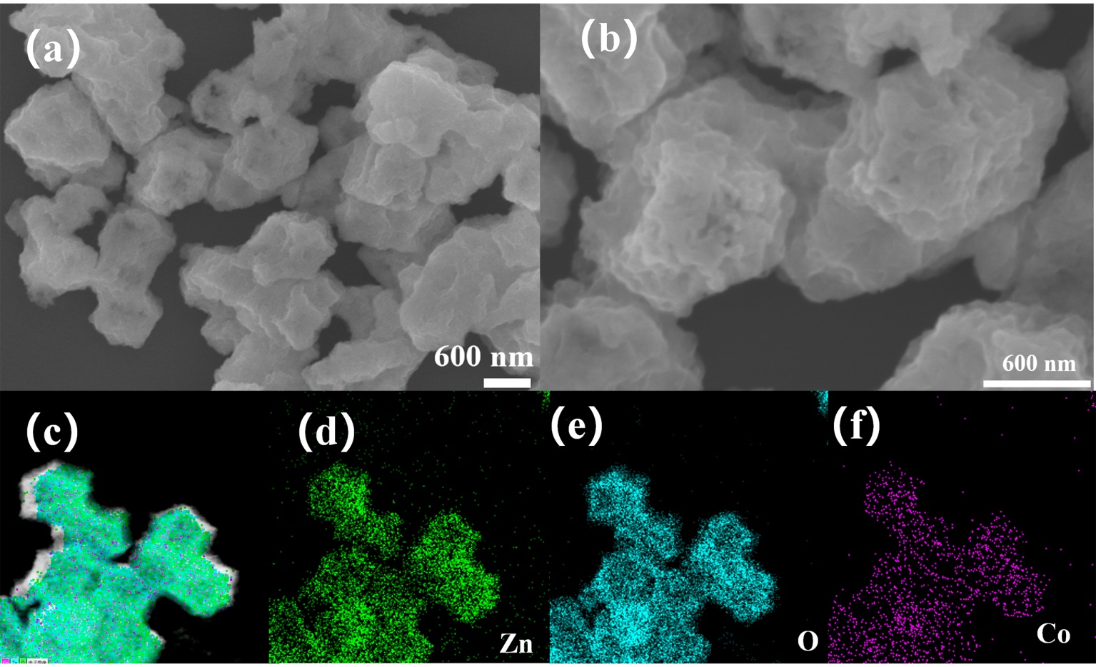 图2. (a),(b) 不同放大倍数下钴掺杂ZIF-8的扫描电子显微镜(SEM)图像;(c) EDS能谱叠加图及(d)~(f)对应的锌(Zn)、氧(O)和钴(Co)元素分布图,显示钴在颗粒内具有空间一致的分布特征