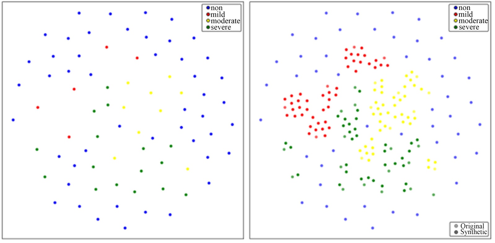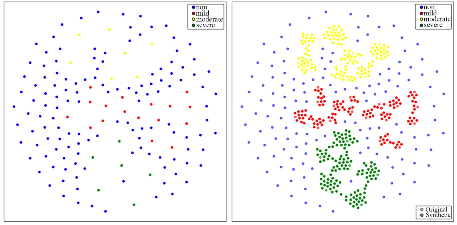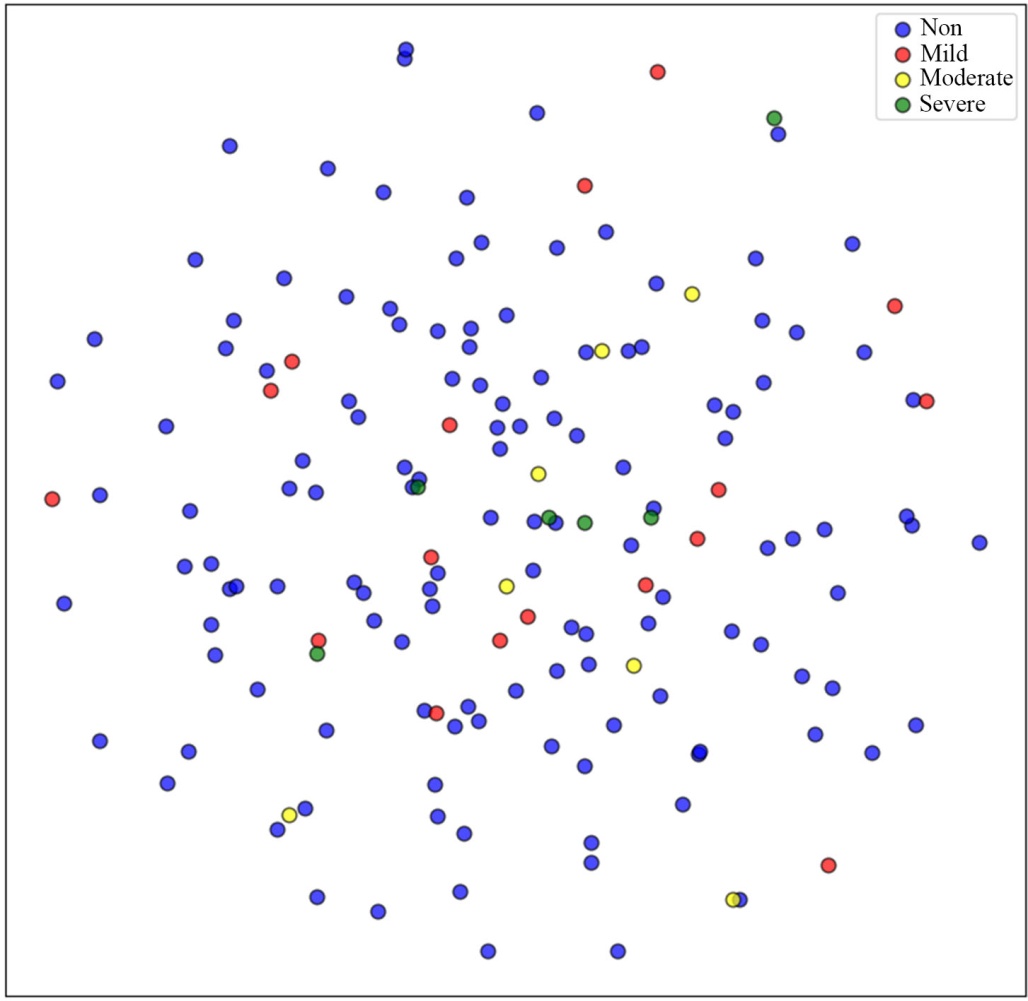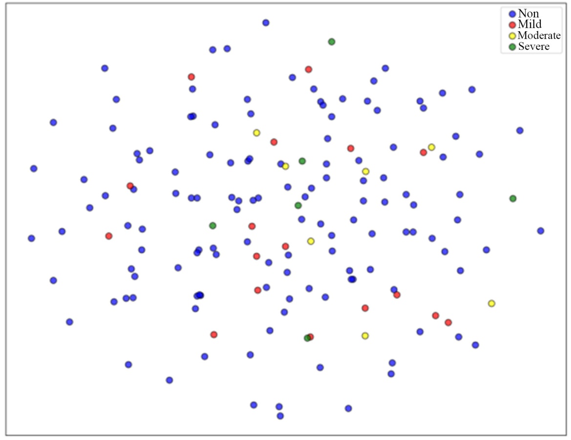 。在抑郁症检测识别中,轻度与中度症状表现出交叉特征,即既不完全健康也未达重度阈值,选择略微倾向“硬聚类”但仍保留少量交叠的
