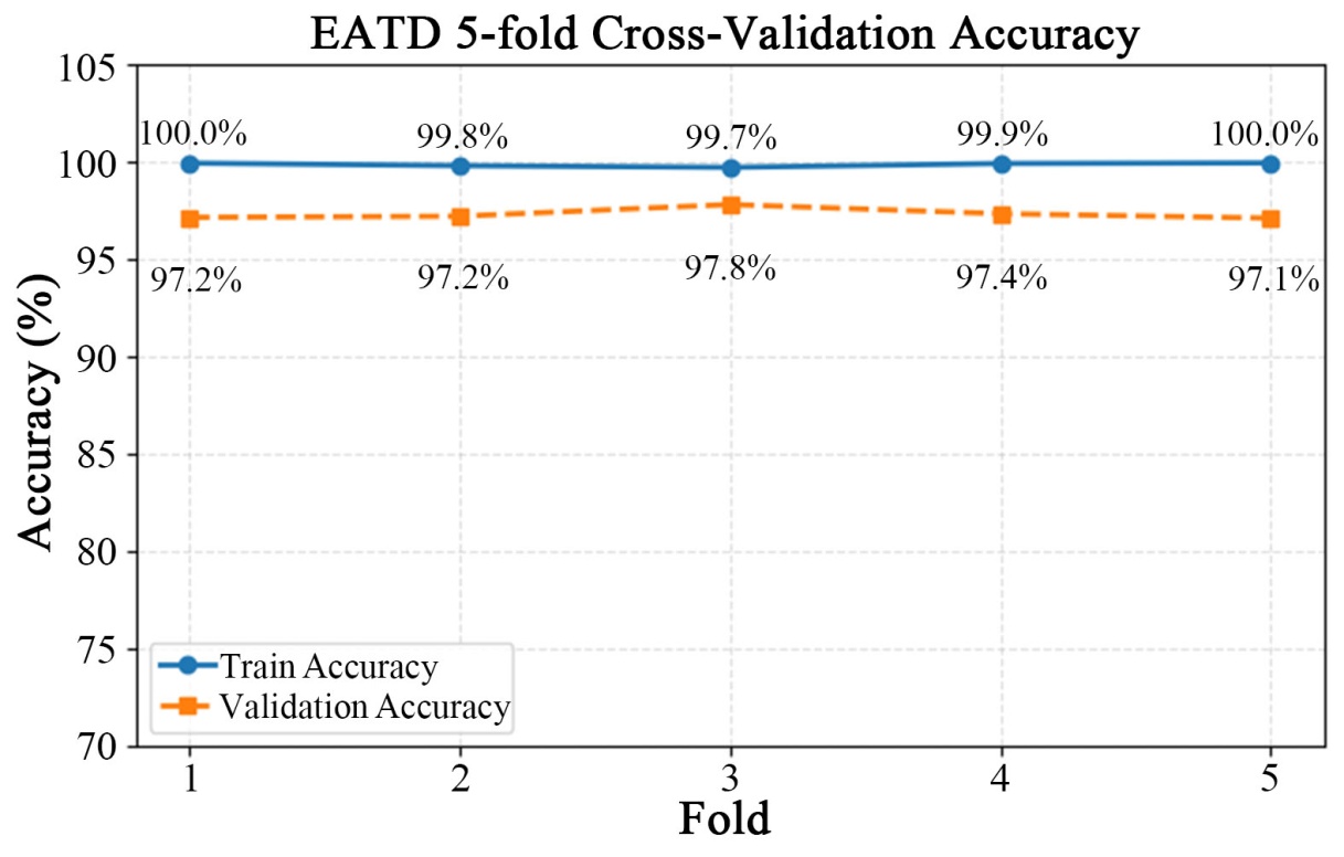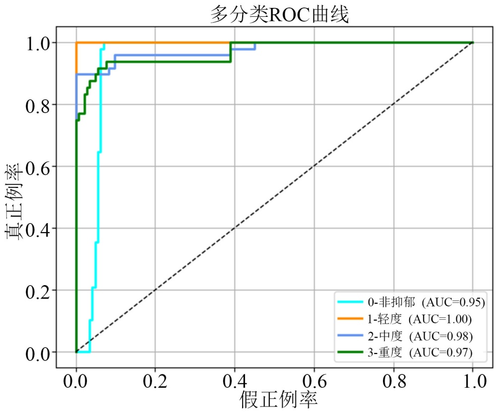 图11为CMDC数据集四分类任务的多分类ROC结果,非抑郁、轻度、中度和重度四个类别的AUC分别为0.95、1.00、0.98和0.97,均保持在0.95以上,高AUC值表明模型在各抑郁等级与非抑郁类别之间具有较强的区分能力和稳定的判别性能。对比两个数据集的实验结果,EATD-Corpus上准确率和F1得分均为0.97,而在样本量更小、类别分布更不均衡的CMDC数据集上整体准确率降至0.94,主要由CMDC中轻度抑郁样本极度稀缺、类别边界更为模糊所致,该结论与图3所示的CMDC数据集使用SMOTE技术前后特征分布变化相对应。由此可见,本文在训练阶段结合SMOTE进行少数类重采样,通过交叉注意力机制对齐音频与文本的互补信息,利用FCM实现模糊边界的软划分,使得模型在小样本、不平衡场景下能够保持对不同抑郁程度的高判别力和良好鲁棒性。