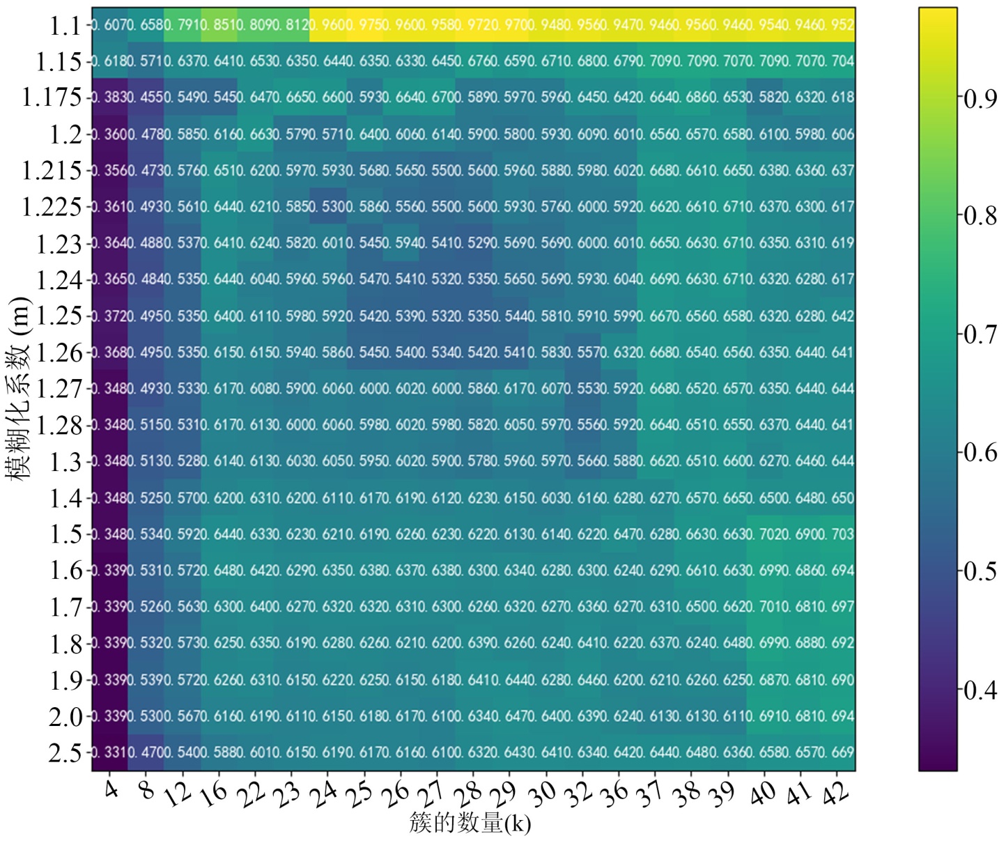 为可视化FCM最优参数选取策略,以EATD-Corpus数据集为例,图9展示了FCM算法的超参数优化结果,以F1分数作为性能评价指标,对不同模糊系数 和簇数 组合下的分类效果进行可视化,在