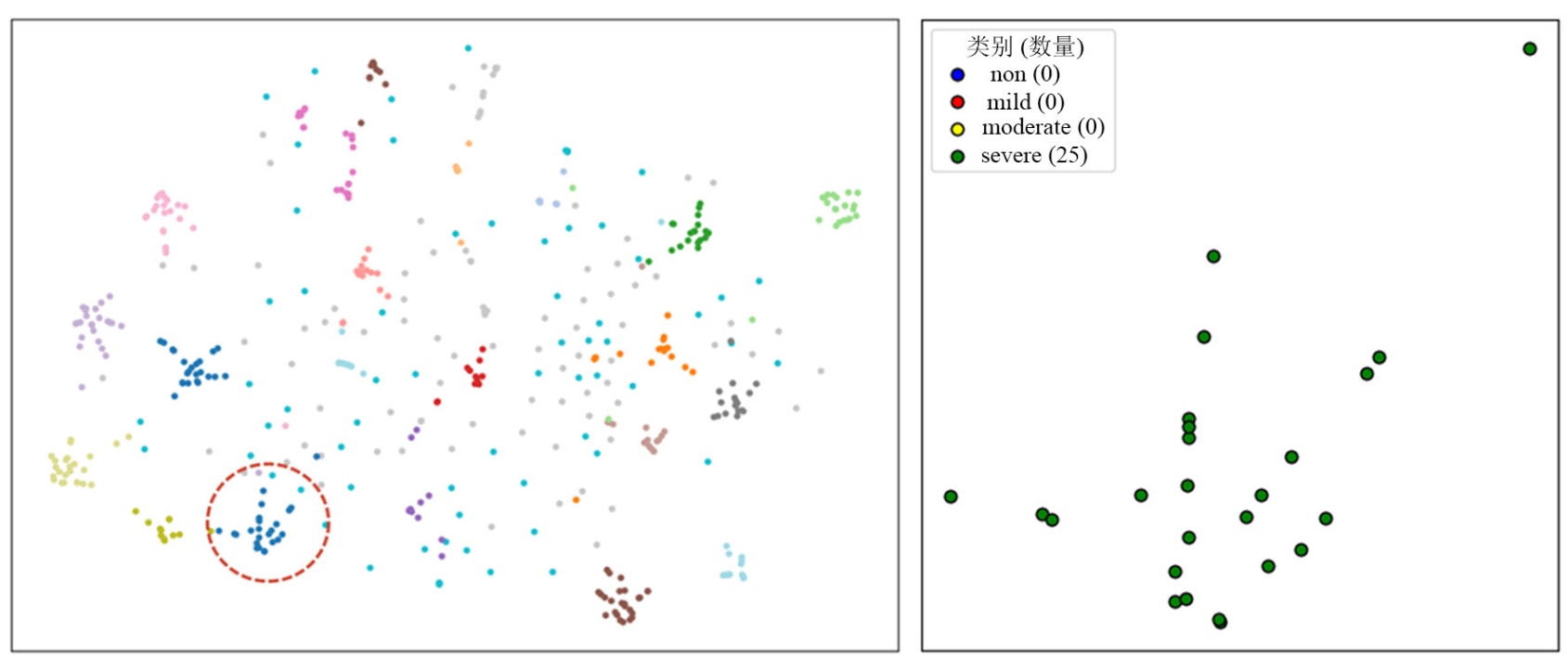 图10展示了对融合特征使用FCM后,各簇族分布情况及第一簇族样本点的分类情况。左侧子图使用不同颜色标识了25个簇族在投影空间中的聚集结构,可发现簇内同质性、簇间可分性以及局部连续性均得到较好体现,为后续的簇族–类别标签映射与分类提供了可靠的可视化支撑。图中用红色虚线圈出的为第一簇族,右侧子图对该簇族样本点进行局部放大,并按照真实四分类标签对样本点着色,同时统计簇内各标签的出现频次以实现“簇族–类别”映射。如图所示,第一簇族由 25 个样本点构成,且全部样本真实标签均为“重度抑郁”,因此该簇族被映射为类别 3,验证了所采用多数投票映射策略的有效性和簇内标签一致性的高度聚集特征。