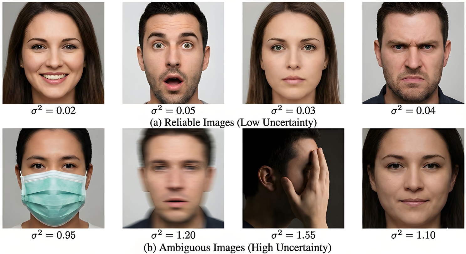 进行了可视化分析。本文从RAF-DB测试集中选取了两组具有代表性的样本:(a)包含清晰表情的高置信度样本,以及(b)包含遮挡、运动模糊或非典型姿态的高歧义样本。如图3(a)所示,对于表情特征显著、光照均匀且无遮挡的图像,模型预测出的方差值极低(