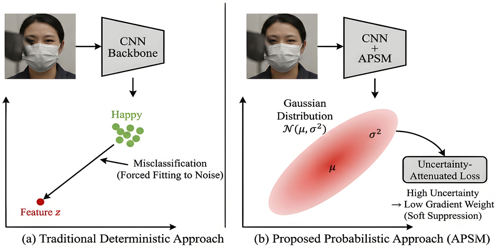 图1. 本文方法与现有方法的框架对比如下:传统确定性方法(a)因强制拟合模糊样本导致特征空间扭曲,而本文提出的概率化APSM方法(b)通过高斯分布建模不确定性,实现了对噪声与歧义数据的自动感知与抑制