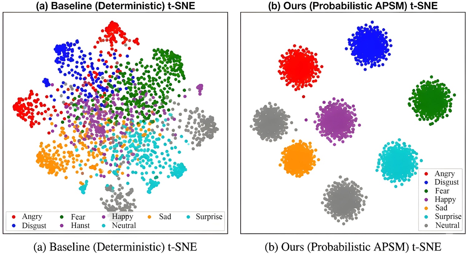 Figure 4. Visualization comparison of t-SNE feature space distributions between the Baseline (a) and our APSM method (b) on the RAF-DB dataset