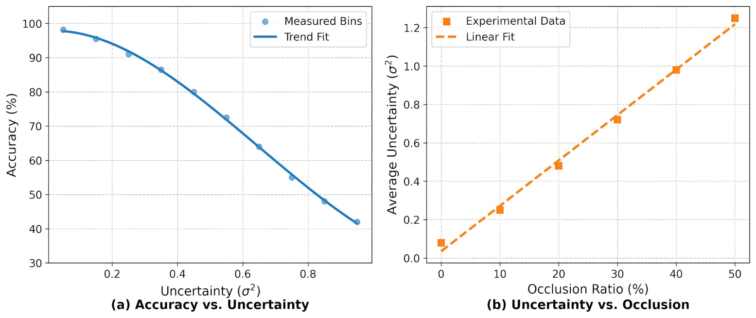 图5. 定量统计分析:(a) 预测不确定性区间与模型分类准确率呈强负相关;(b) 图像遮挡比例与模型输出的平均不确定性呈线性正相关