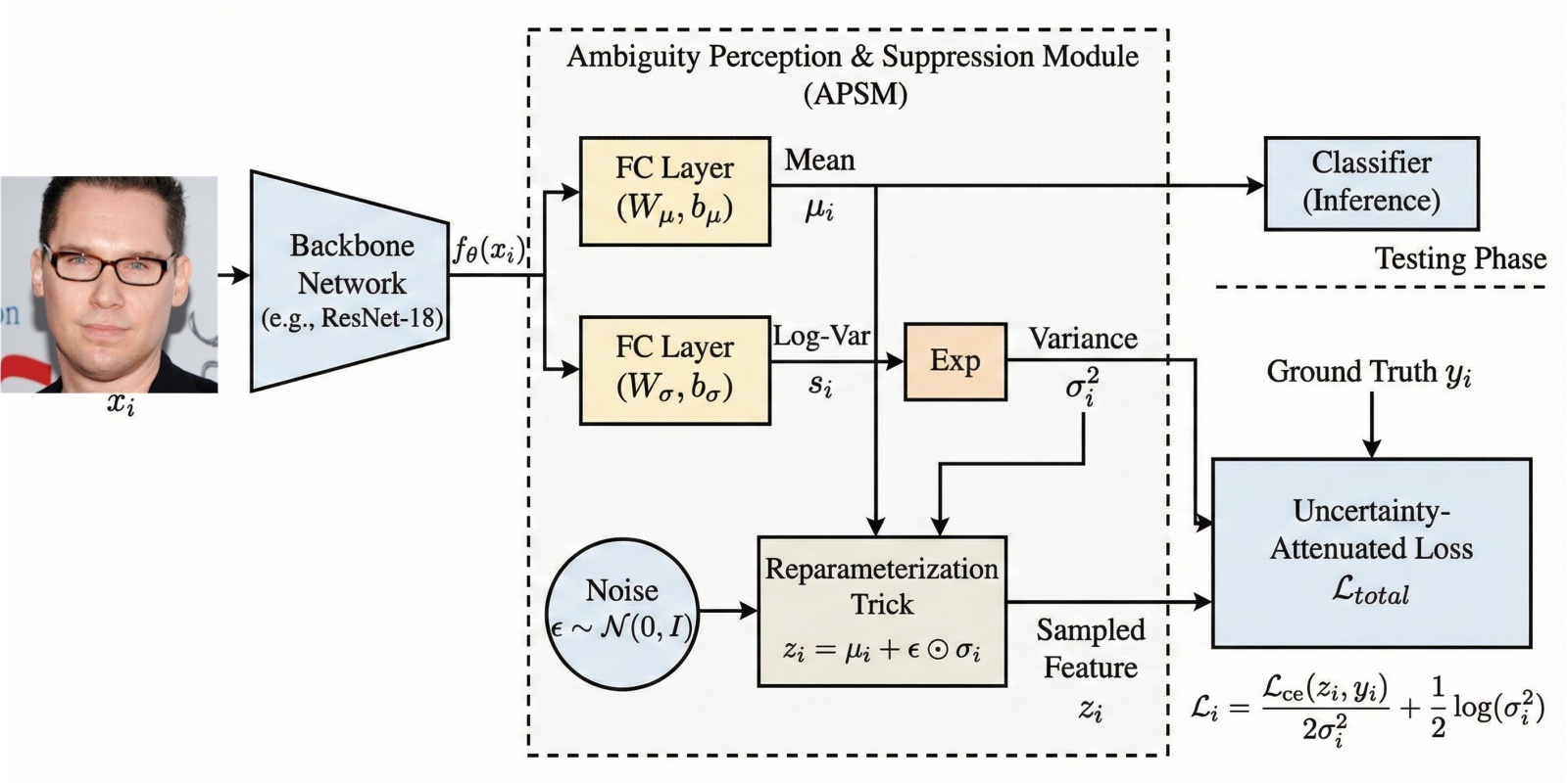本文针对真实世界面部表情识别(FER)中普遍存在的标签噪声和数据歧义性问题,提出了一种新颖且通用的歧义感知抑制模块(APSM)。与现有方法依赖复杂的标签分布学习或注意力机制不同,本文从特征建模的底层视角出发,基于贝叶斯不确定性理论,通过引入概率嵌入(Probabilistic Embedding)将确定性的特征点重构为服从高斯分布的随机变量,并设计了不确定性衰减损失(Uncertainty Suppression Loss)来动态调节样本权重。未来将尝试把这一概率框架扩展至视频表情识别领域,利用时序上下文进一步校准不确定性估计,以实现更精准的动态表情分析。