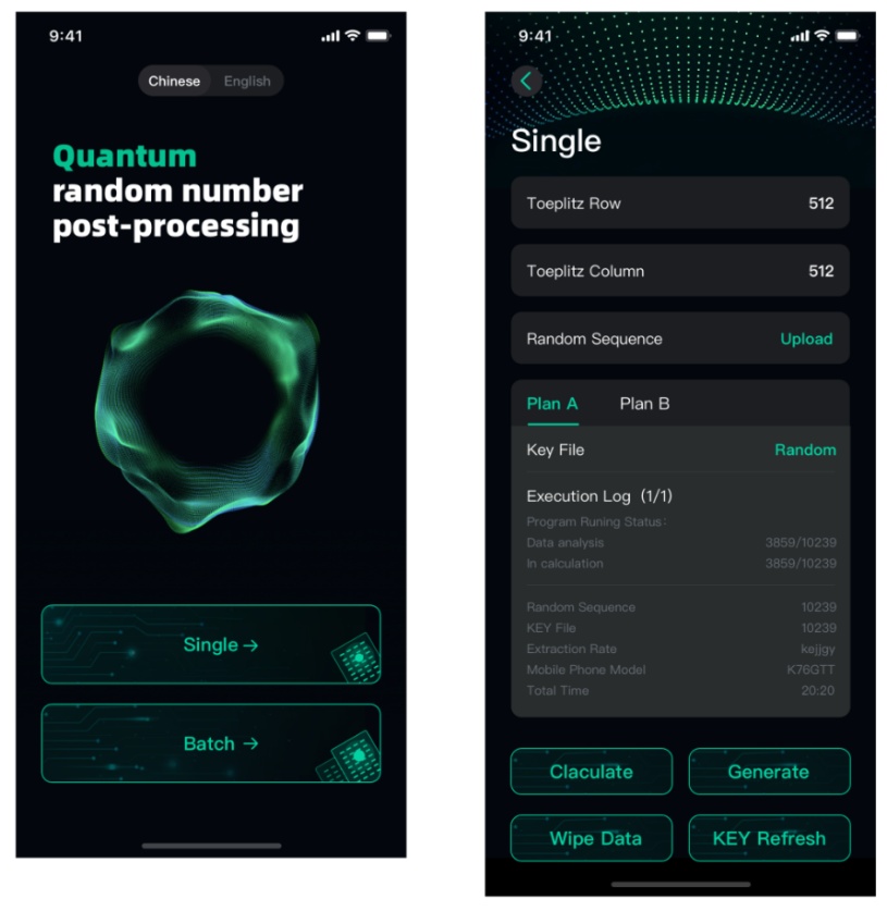 具体而言,开发了量子随机数的移动端后处理程序,支持安卓手机终端为载体,支持最常见的Toeplitz矩阵为实现后处理程序的最基础算法,支持随机生成或选取指定文件作为Key数据,如图1所示;提供中英文操作界面;支持最大10M的文件单次处理以及最多100个文件的批处理功能;支持数据看板、实时监控计算进度以及内存使用率图表、分析设备计算力等功能。这将加速并扩展量子随机数芯片在手机、平板等移动端的应用。
