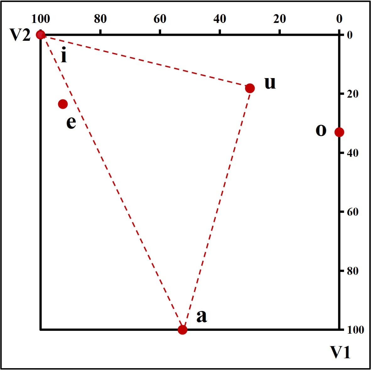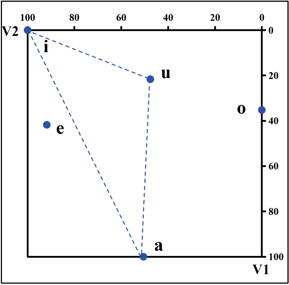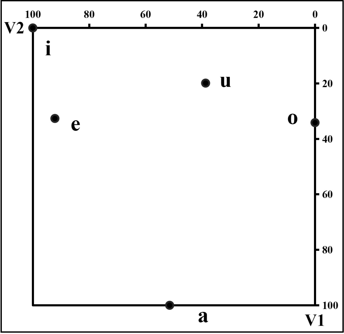 元音格局标准图形中,V1表示元音舌位高低,V2表示元音舌位前后。元音/i/、/u/的V1值处于0~30范围,属于高元音;元音/e/、/o/的V1值处于30~70范围,属于中元音;元音/a/的V1值处于70~100范围,属于低元音。高元音的/i/、中元音的/e/ V2值分别处于80~100和70~100范围,属于前元音;中元音/o/的V2值处于0~30范围,属于后元音;低元音/a/的V2值处于40~60范围,属于央元音;而高元音/u/的V2值为38.77,处于20~80范围,属于央元音,这与高元音/u/常规的后元音分类不符,呈现出舌位前移的倾向。
