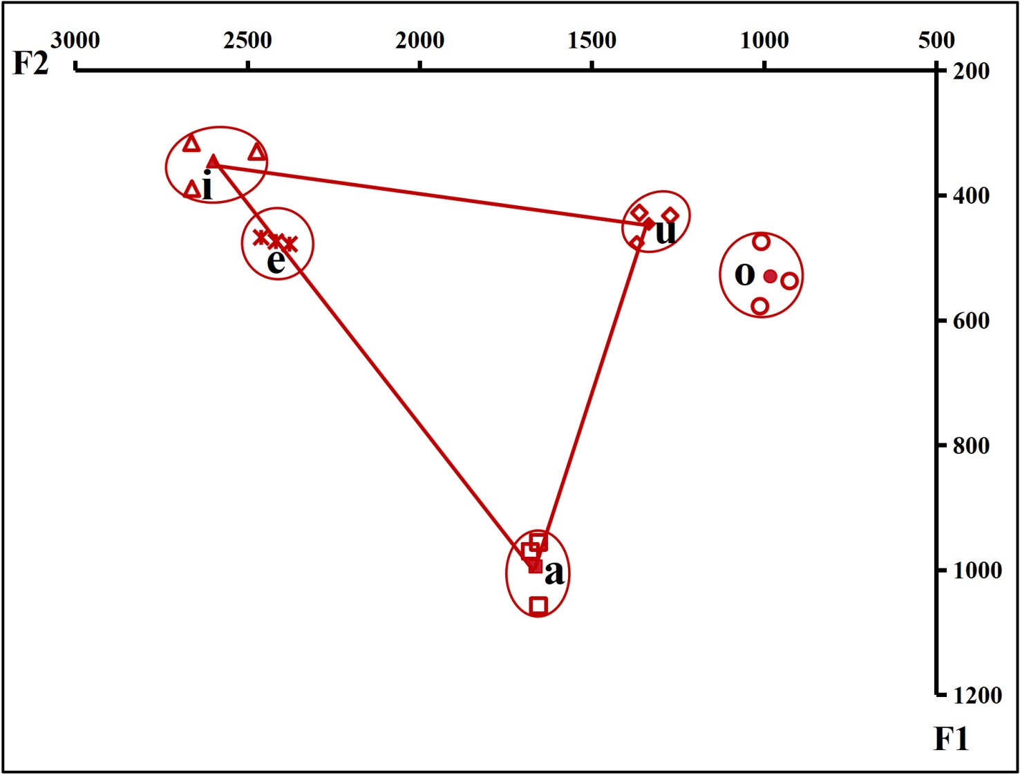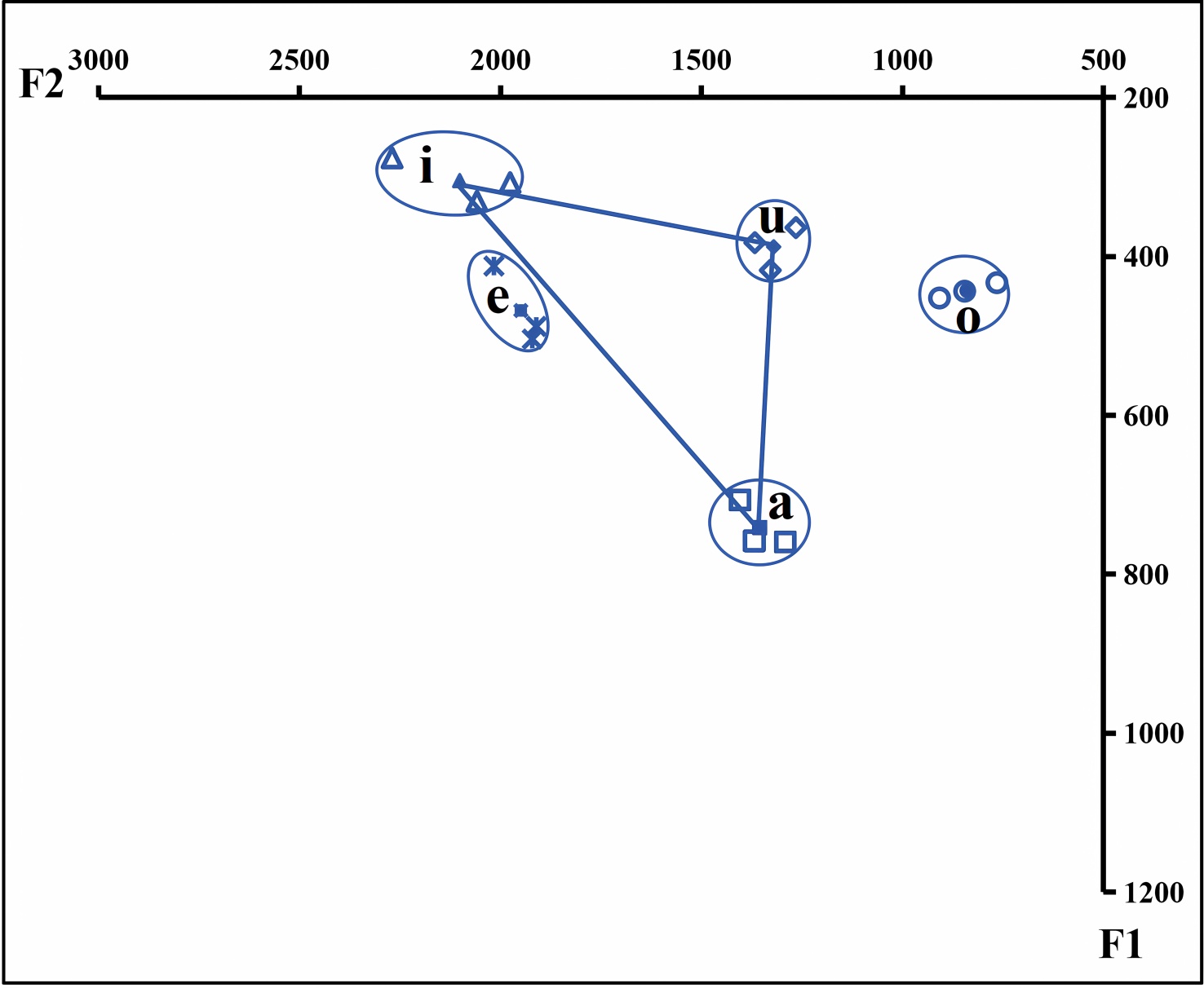 Figure 3. Acoustic vowel chart of three male speakers