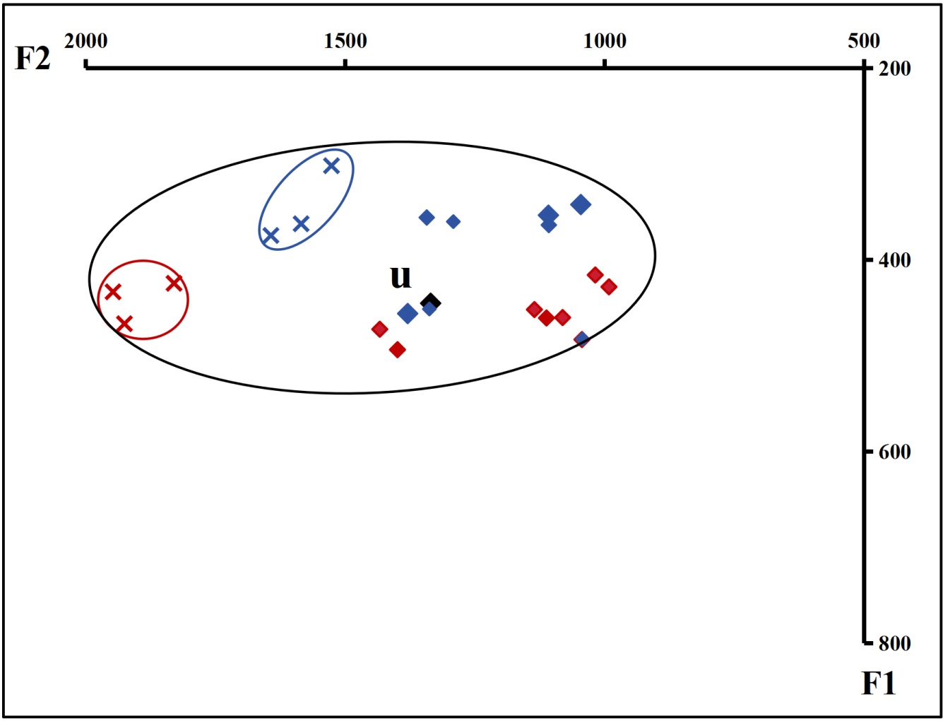 Figure 8. Acoustic vowel chart of /u/ (Excluding “shui (water)”)