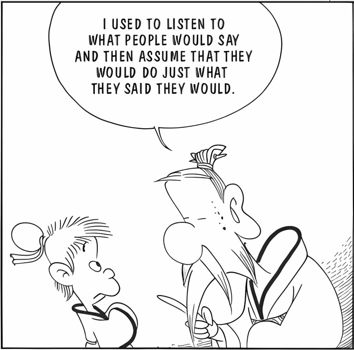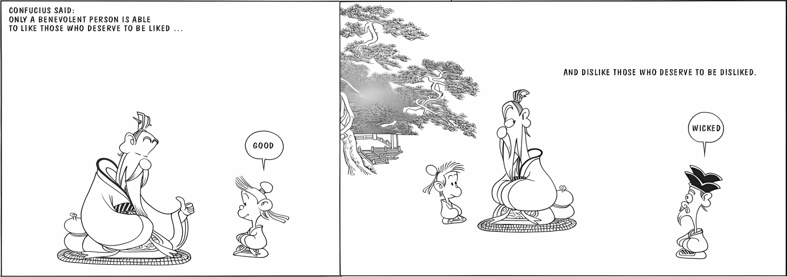 思维泡出现的情况较少,如图9,选自《里仁第四——三》,图像中虽有GOOD和WICKED的字样,但这并不是直接说出来的,而是用以辅助解释人物所展现的性质,集中体现了儒家以“仁”为核心的道德哲学思想,唯有通过修养达到“仁”的境界,才能具备正确的道德判断能力。