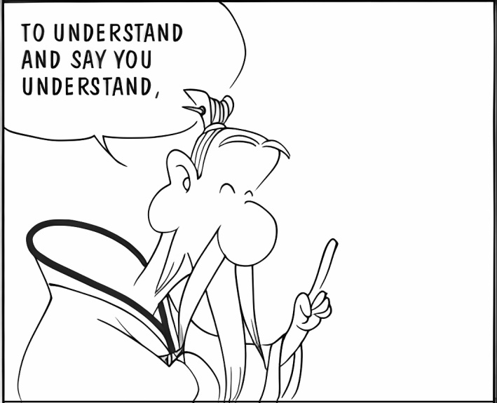 参与者在涉及概念意义时,主要关注的是角色的身份和属性,即参与者属性和参与者表征[10]。同时参与者属性不仅涵盖人或事物的本体特征,更深度关联于其符号化表征所承载的象征意义。如图4所示,题为PLEASURE AND DIGNITY的故事出自《学而第一——一》,孔子盘腿而坐低头读书的形象具有象征意义,引导读者对本节故事展开想象,通过文字辅助联想其背后的深层含义,引出下一幕“学而时习之不亦说乎”的图像文字,同时也传达出孔子“有教无类”的教育思想。而参与者表征是指图像所呈现的人物、事物及其属性的符号化方式,涵盖其本体属性,如形态、动作等物理特征,与象征属性,如文化隐喻、社会身份等深层意义。以孔子形象为例,如图5与图6所示,孔子被描绘为席地而坐、双目微闭、身着宽袍的长者形象。在中国文化语境中,这种姿态与服饰通常与内省、中和与君子风范等儒家价值相关联。然而,在英译漫画的跨文化传播情境中,这一视觉形象并不会被英语读者以同样的文化代码解读。相反,宽袍与静坐的造型更容易被纳入西方视觉文化中智者或冥想者的既有图式之中,使孔子被理解为一位具有普遍哲学意味的精神导师,而非特定历史语境中的政治思想家。这种由文化差异引发的视觉意义重构,并非简单的“误读”,而是一种使儒学思想得以进入西方认知框架的跨文化适配机制,体现了视觉资源在多模态翻译中的中介作用。而参与者表征的本质是视觉符号与社会文化认知的互动协商过程。