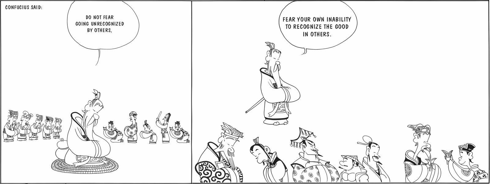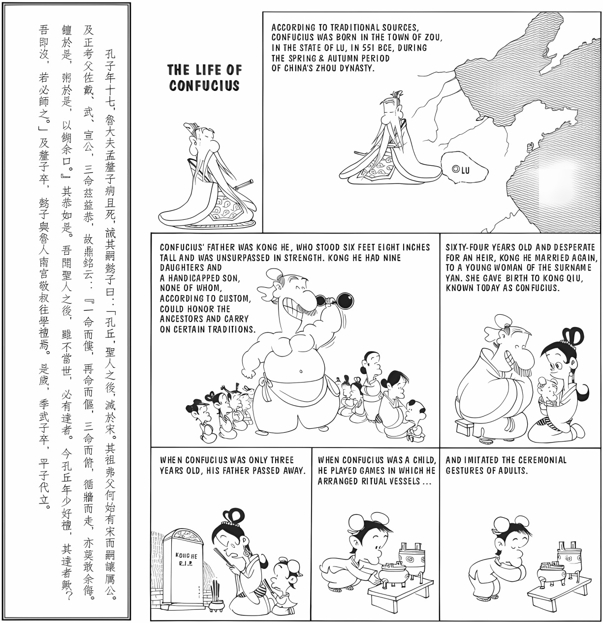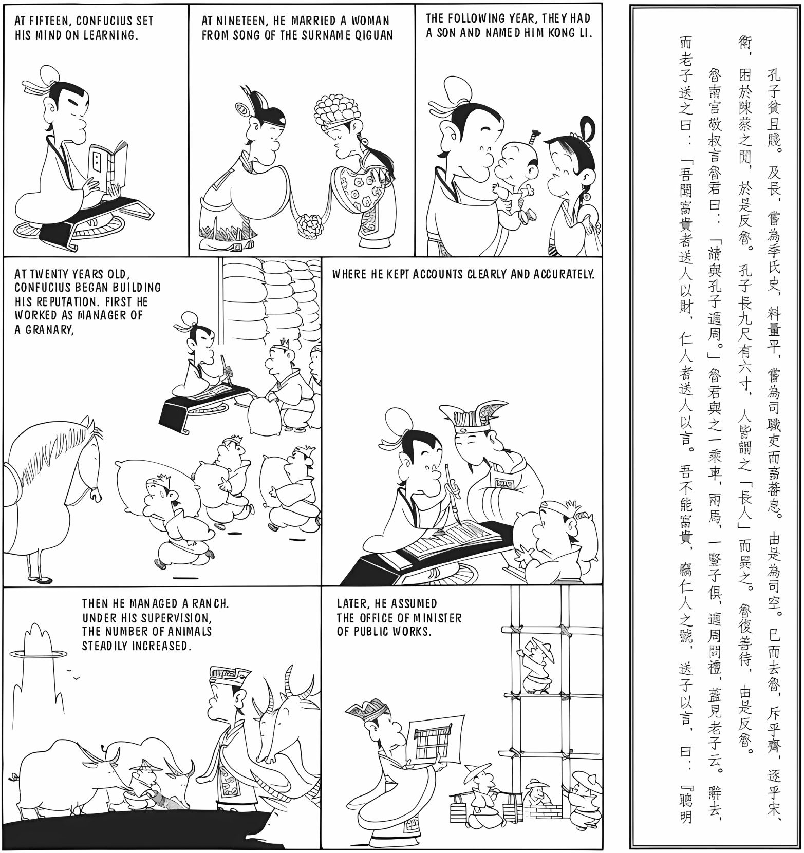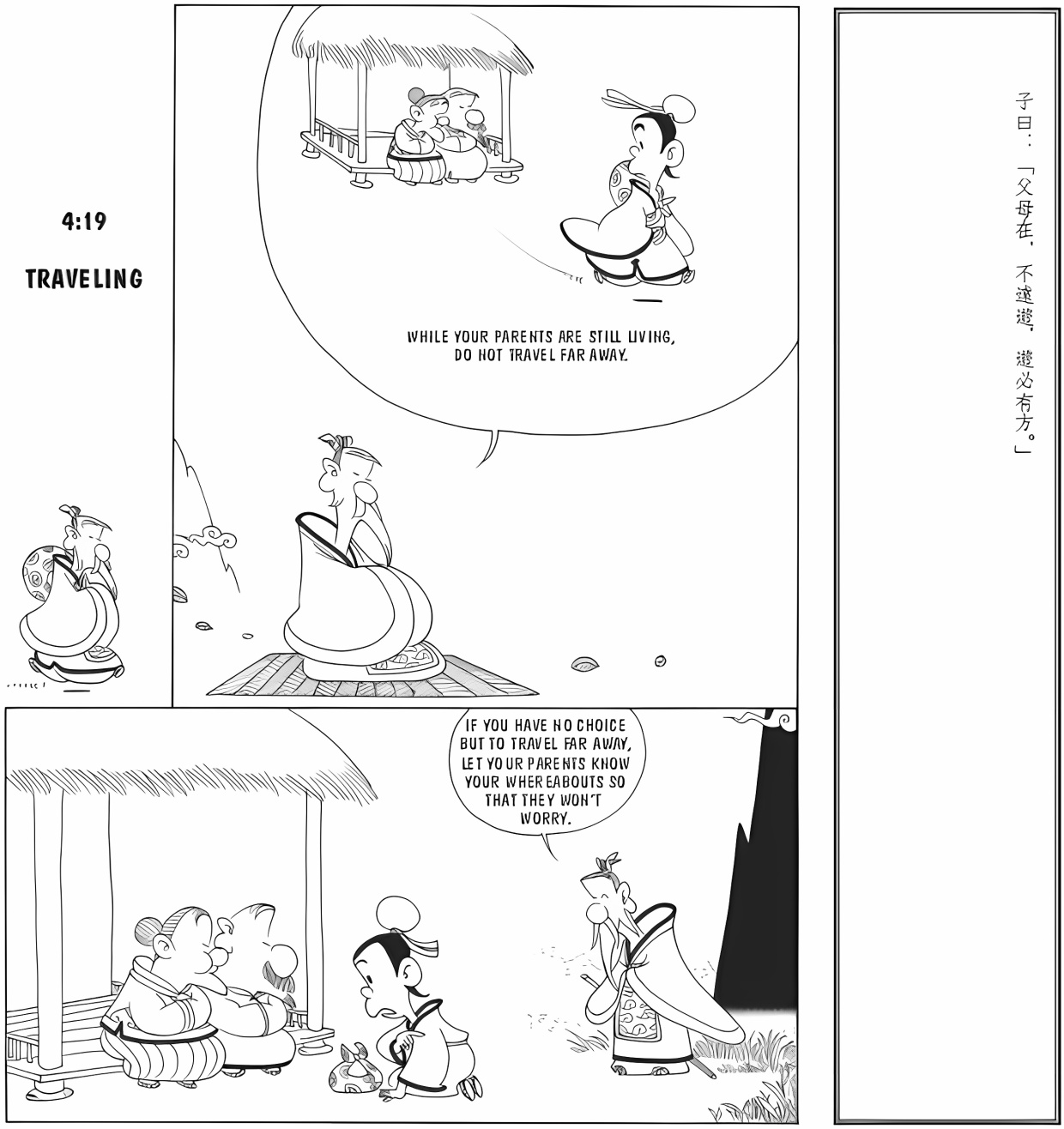相较于传统的文字版本,漫画版《孔子说》英译本通过图像叙事与文本解说的协同模式诠释儒家思想,其文本形态表现为视觉符号与语言符号的有机复合体。