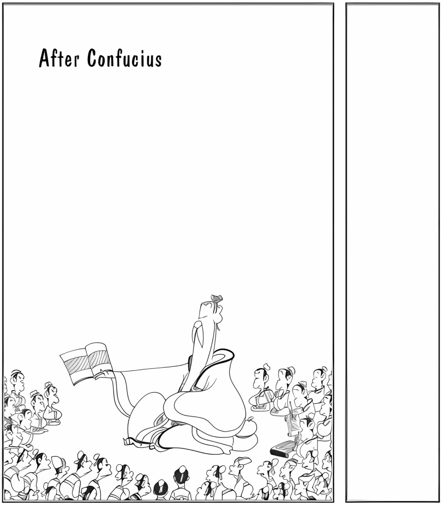 《孔子说》的页面布局模式分为以下三种:1) 以文字为主,图像作为辅助配合文字输出内容意义,如图10所示,选自《孔子说》第一章《孔子的一生》,该页面布局是典型的文字为主布局模式。2) 以图像为主,文字作为辅助配合图像输出内容意义,如图11所示,选自《里仁第四——十九》,该页面布局是典型的图像为主布局模式。3) 图文均等,图像和文字共同承担内容意义的输出者,在输出内容方面具有同等地位,如图12所示,页面上方配以After Confucius字样,下半部分配以孔子教学的图像场景,该页面布局是典型的图文均等模式。