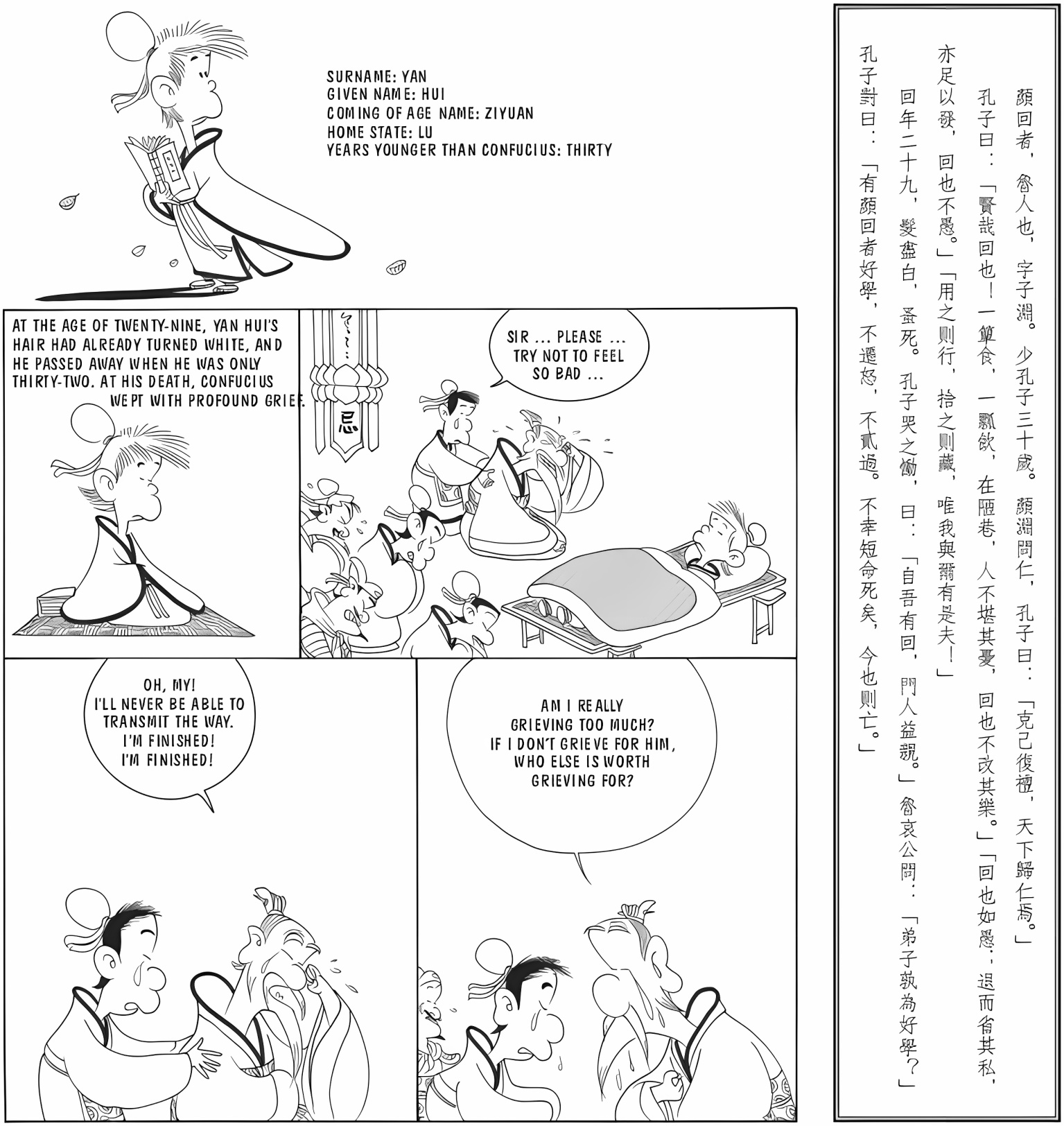 根据Painter等人的论述,框架指对图文边界的框定,是视觉模态组合方式的核心构成要素[10]。其包含的次级内容中,限制图像指通过页边空白对图文进行部分或完全包围的视觉处理方式,而非限制图像则指图文扩展至页面边缘、不设页边空白边界的呈现形式。如图13所示,《孔子说》英译漫画大量采用清晰笔直的黑色边框与留白空间对画格进行限定,这一设计在中国视觉传统中常与节制、凝练与思想空间相关联,但对于习惯于满版色彩与高视觉密度的西方漫画读者而言,则可能产生一种审美上的陌生化效果。这种留白不仅减缓了阅读节奏,也在无形中引导读者将注意力从动作与情节转向言语与思想,使《论语》的哲学话语获得更为突出的认知位置,这种就属于限制图像。与此同时,在限制图像中也有较为明细的分类:重新聚焦、包含、拓展等[10]。在主体图像之外添加补充人物形象,其功能在于强化所描绘内容的叙事焦点。如图14所示,在介绍孔子对颜回的评价时,译本在主体画格之外补充呈现颜回的形象及其基本身份信息(姓、名、字、国别与年龄),这一视觉补充并非冗余,而是针对英语读者缺乏相关文化背景所做的设计。通过将陌生的儒家人物转化为可识别的叙事角色,视觉框架在不增加语言负担的前提下,为西方读者构建了进入儒家思想世界的认知入口。