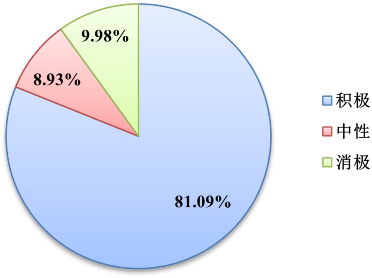 借助VADER情感模型,对1075条有效评论进行情感倾向分析和统计(见图1)。结果显示,中性评论占比仅有8.93%,可见,绝大部分读者对《庄子》英译本的评价都表现出较为明显的情感倾向。总体而言,积极评论占比81.09%,消极评论占比不足10%,说明海外读者对《庄子》英译本整体呈肯定态度,接受意愿普遍较高。