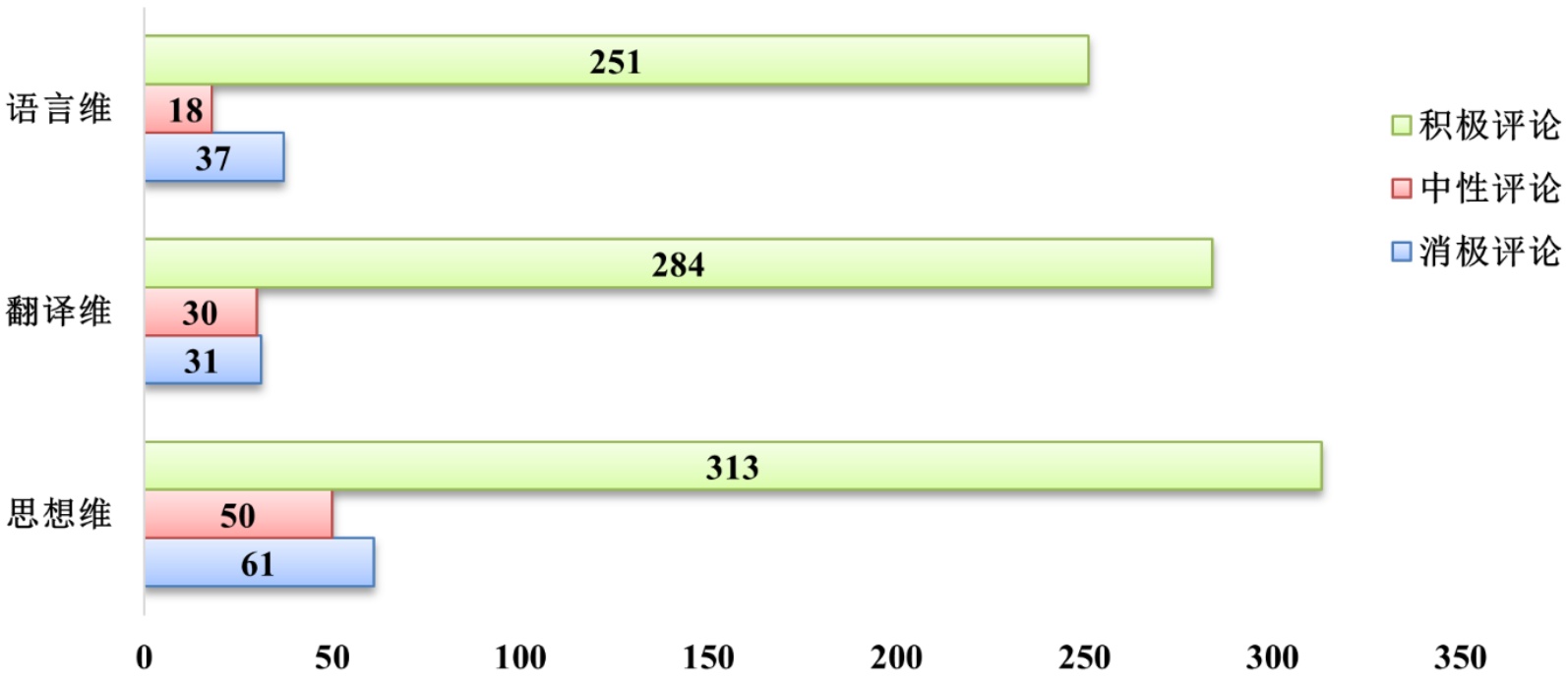 图2数据表明,在三类评论中,涉及哲学思想的评论数最多(424条,约占评论总数的40%),反映了海外读者对《庄子》英译本哲学属性与思想的高度关注;其中积极评价占比较高(达到73.82%),消极评价占比不足15%,可见《庄子》作为道家哲学的经典,其内容所传递出的思想深度和哲理智慧获得了海外读者的普遍认同。