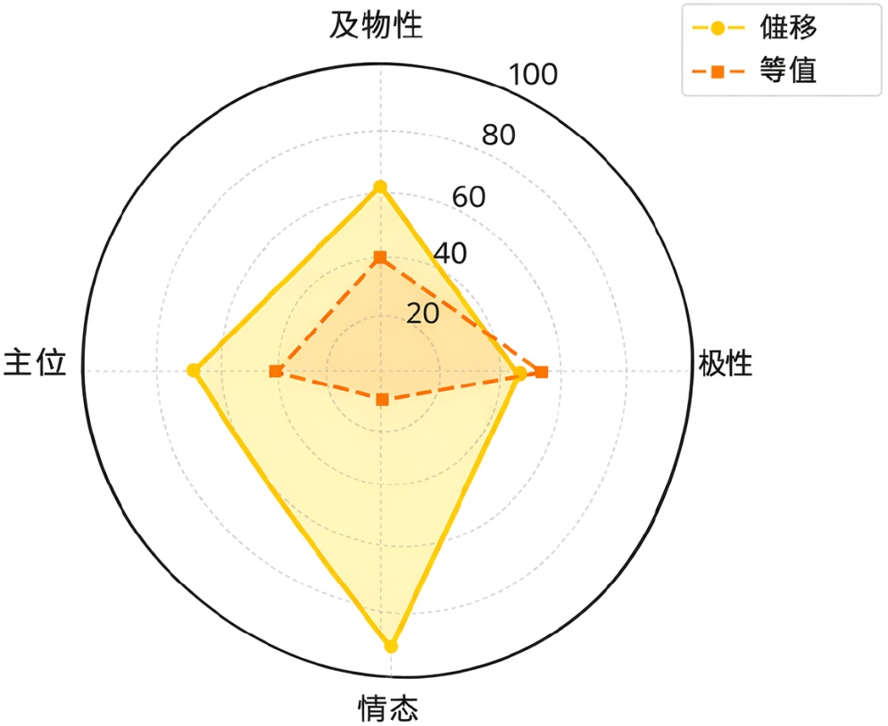 图1展示了在三大元功能下,四个关键语言特征的偏移情况。在经验功能方面,及物性系统的偏移率为61.0%,主要表现为过程类型的重组和从小句到词组的转换。人际功能方面,情态系统的偏移率高达92.4%,表明译员通过调整情态值来重新塑造话语的肯定性、礼貌性或权威性。极性系统的偏移率为46.7%,大多数转变是将源语中的否定结构转为肯定,而将肯定转为否定的情况较少。语篇功能的主位和述位偏移率为63.1%,译员常通过调整主位结构来改变话语起点和信息流动。