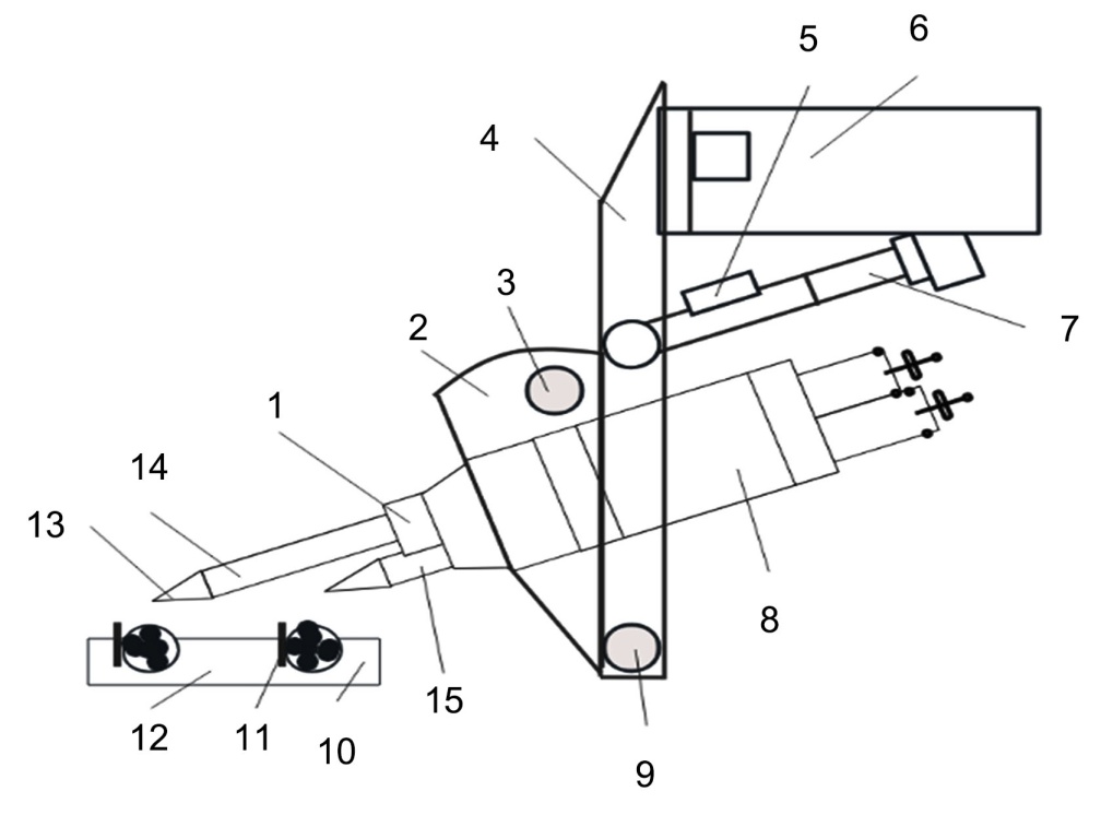 1:外喷胶嘴;2:摆动座;3:螺纹孔;4:固定座;5:压缩空气管;6:气缸支架;7:伸缩气缸;8:胶枪;9:销轴;10:小压板;11:卷烟纸;12:边板;13:陶瓷喷头;14:金属管;15:内喷喷嘴。