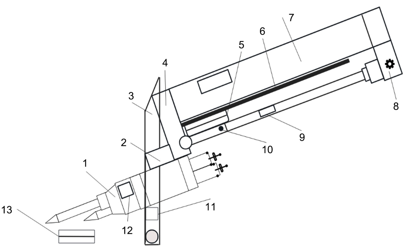 1:胶枪;2:胶枪固定块;3:可调底座;4:连接块;5:滑块;6:气缸支架;7:直线导轨;8:鱼眼接头;9:气缸;10:异形螺钉;11:导向块;12:定位块;13:止挡块。
