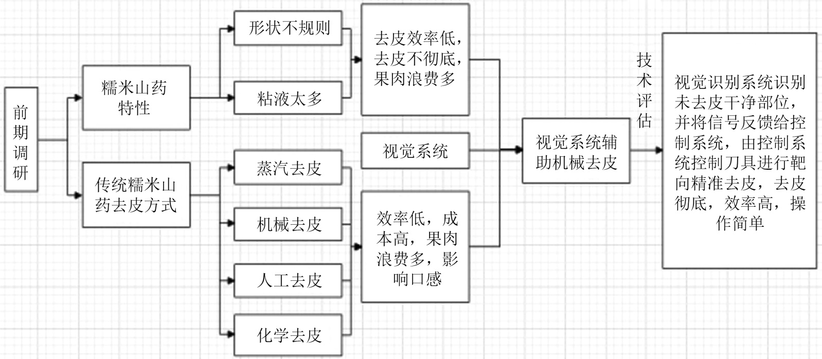 实现机械化去皮是突破产业瓶颈的必然选择[3]。然而,糯米山药独特的物理特性(如表皮凹凸不平、个体弯曲度大、果肉脆性高、表面粘液丰富)使得通用型根茎作物去皮设备(如滚筒摩擦式、毛刷式)难以直接适用[4],存在去皮不净、果肉损伤率高、破损严重等问题。近年来,随着机器视觉、柔性执行器等智能农业装备技术的发展,针对不规则农产品的自适应加工成为研究热点[5] [6]。然而,针对糯米山药这一兼具高粘液、高脆性特征的特殊物料,尚未见成熟的机械化去皮解决方案。