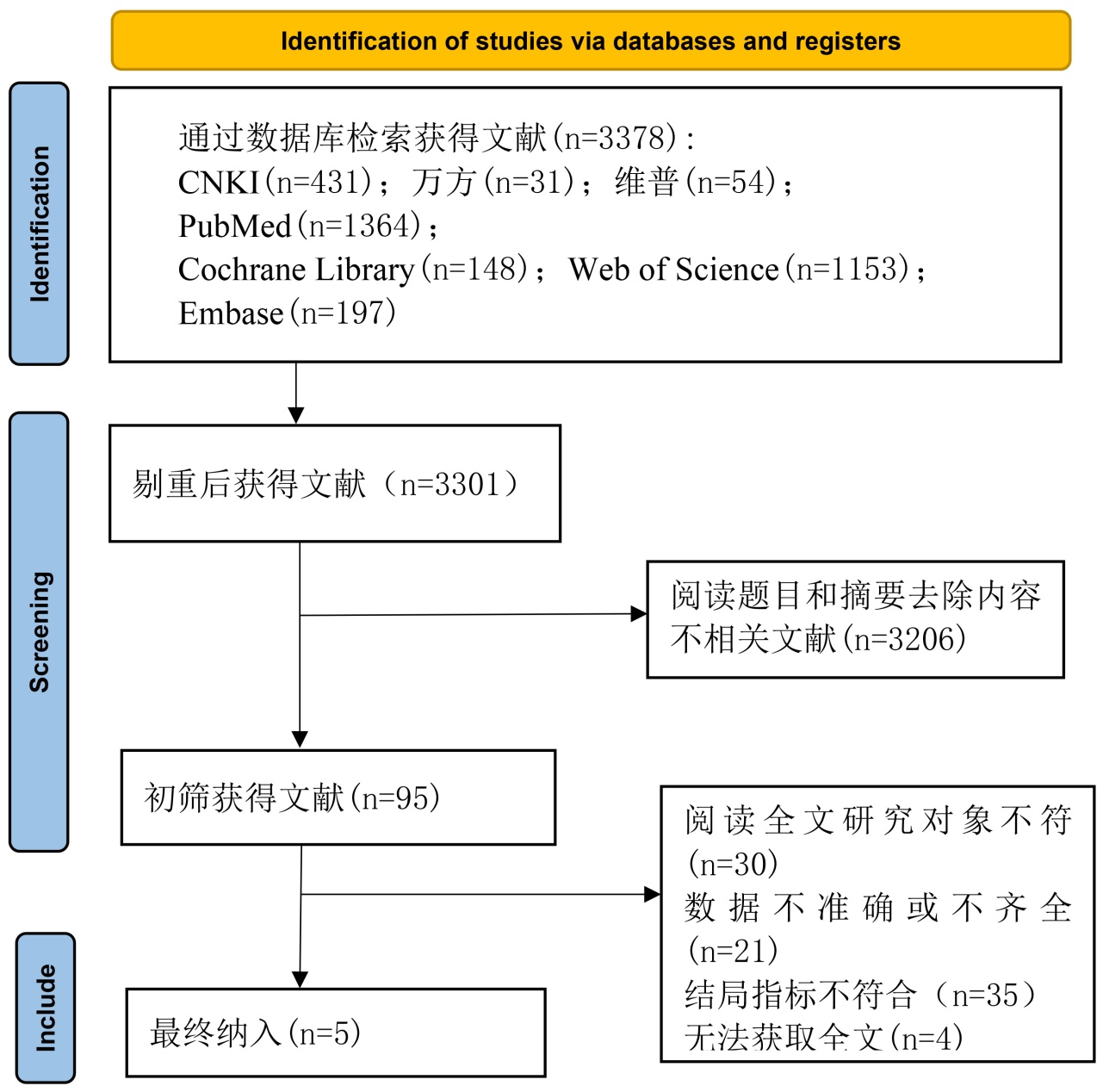 初步检索后共获得相关文献3378篇,利用Zotero和人工去重后剩余3301篇;通过阅读文献标题和摘要筛选后剩余95篇,进一步阅读全文后剔除研究对象不符合纳入标准的30篇、可用数据不准确或不齐全的21篇、结局指标不符合的35篇、无法获取全文的4篇,最终纳入5篇文献[8]-[12],见图1。