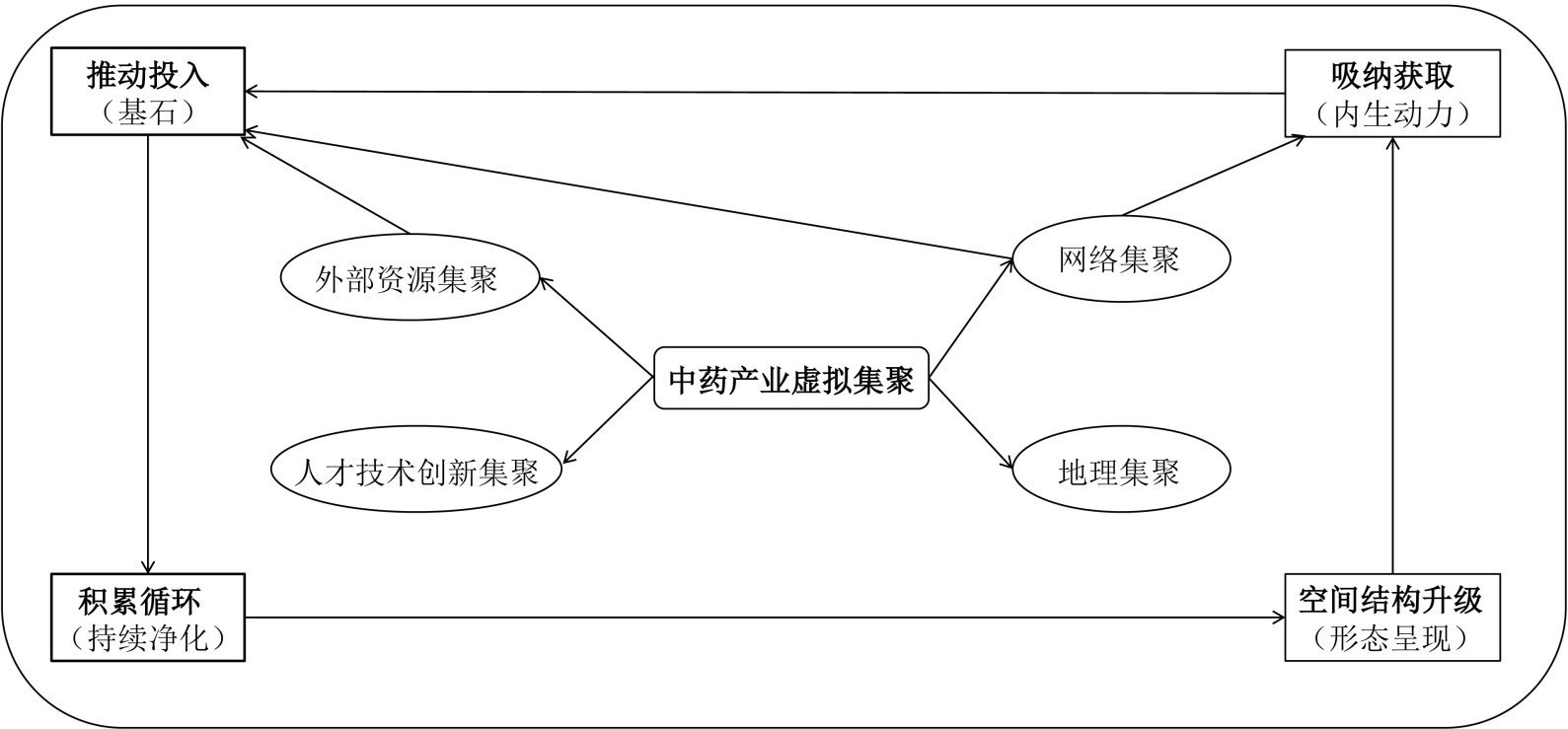 该环节是对系统运行中产生的新资源主要是数据与知识进行沉淀、整合与再配置,并使其反馈至前序环节,从而形成正向增强回路的关键过程。在中药产业虚拟集聚中,日常运行持续产生海量数据,包括线上诊疗数据、药材交易流通数据、用户健康行为数据等。通过大数据分析与知识发现技术,这些数据被转化为新的数字本草知识,例如揭示药材品质与生长环境关联的模型、对方剂疗效进行人群细分归类的规律等。这些新生成的知识进而反哺系统:它们能够优化数据资源库与基础设施规划,从而作用于推动投入环节;可以指引更精准的技术研发与人才培养方向,从而影响吸纳获取环节;还能够催生更高效的服务模式与商业模式,从而驱动空间结构升级环节的演进。由此,整个系统得以向更高水平持续进化。