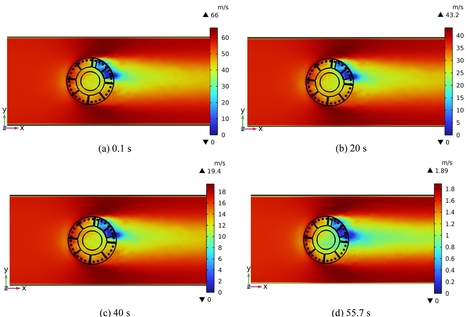 (1) 列车制动时,制动盘流道表面流场速度分布呈现显著的空间非均匀性,在制动初期,尾迹现象迅速形成,并沿气流方向往上游区域扩展。随着流动逐渐趋于稳定,湍流得到充分发展,尾迹扩展范围不再向上游延伸,空间分布范围和形态特征仍然清晰可辨。但其在整个制动过程中尾迹现象几乎一致,只有流速的变化,这说明尾迹现象与周围流体之间存在着显著的耦合效应,二者之间的能量交换和动量传递过程表现出较强的动力学特性。