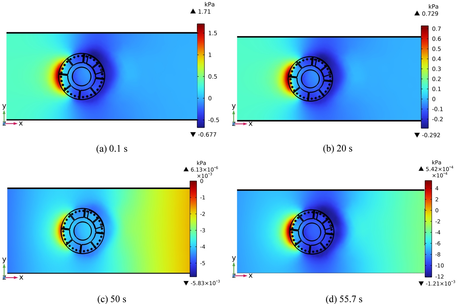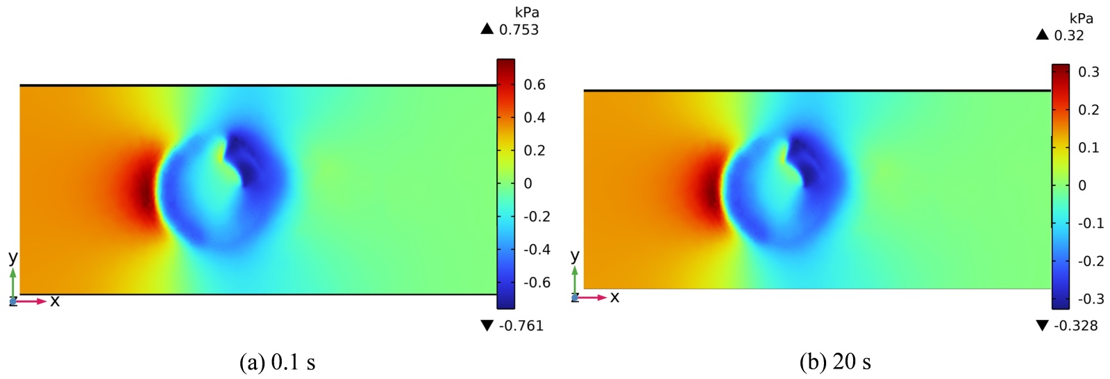 仿真云图7表明,制动盘周围区域呈现出明显的压力梯度变化特征,表现为: