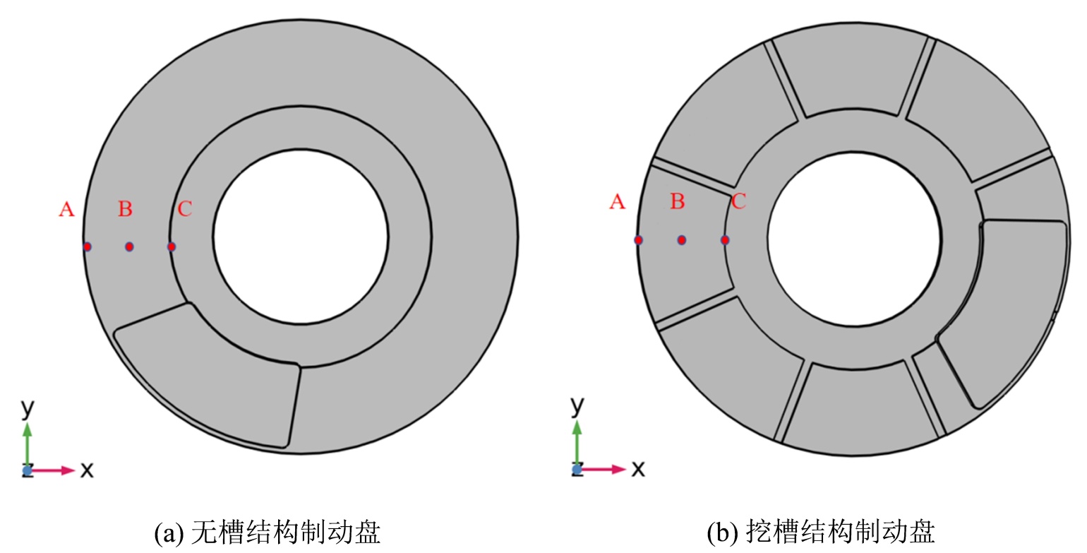 本小节主要研究两种不同结构制动盘的热力耦合分布规律,制动盘选用同种材料(合金钢),制动片均选用铜基粉末冶金材料。研究制动盘摩擦面三个关键点(A, B, C)在整个制动过程中温度和应力随时间的变化趋势并进行对比分析,如图10所示。