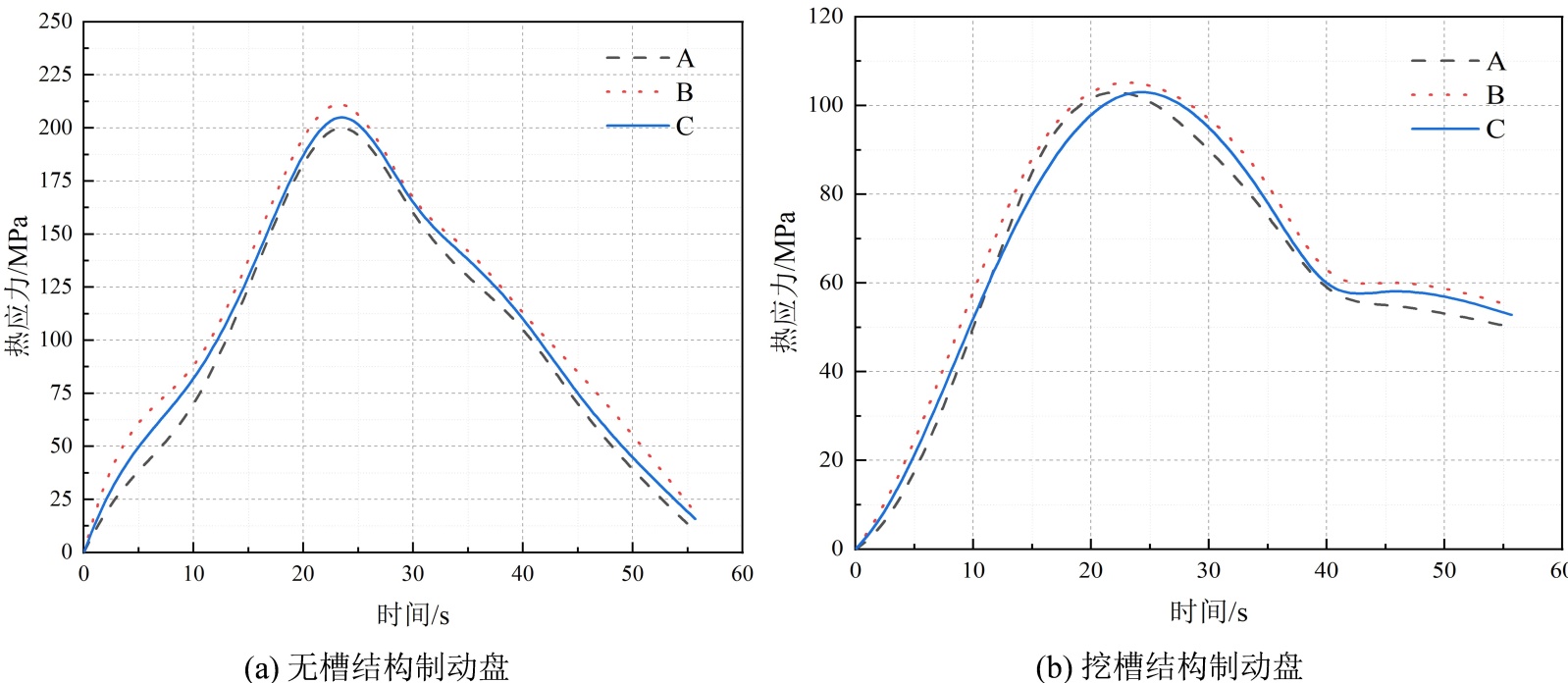 图11. 不同结构制动盘A、B、C三点应力变化曲线图