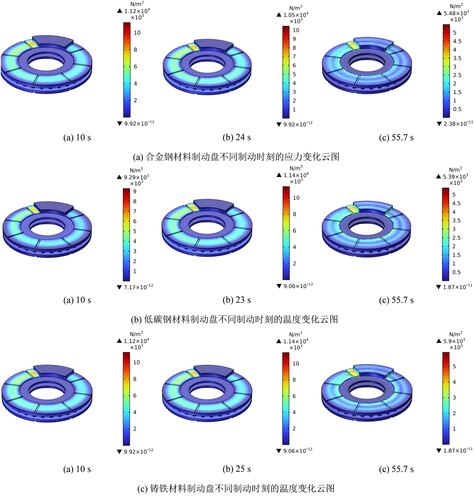 本小节主要研究不同材料制动盘的热力耦合分布规律,制动盘选用不同材料,制动片均选用铜基粉末冶金材料。图12研究了提取制动盘制动过程中三个关键时刻的温度场分布,分别为10 s、30 s左右(温度峰值时刻)和55.7 s (制动结束时刻);图13研究了提取制动盘制动过程中三个关键时刻的应力场分布,分别为10 s、23 s左右(应力峰值时刻)和55.7 s (制动结束时刻)。