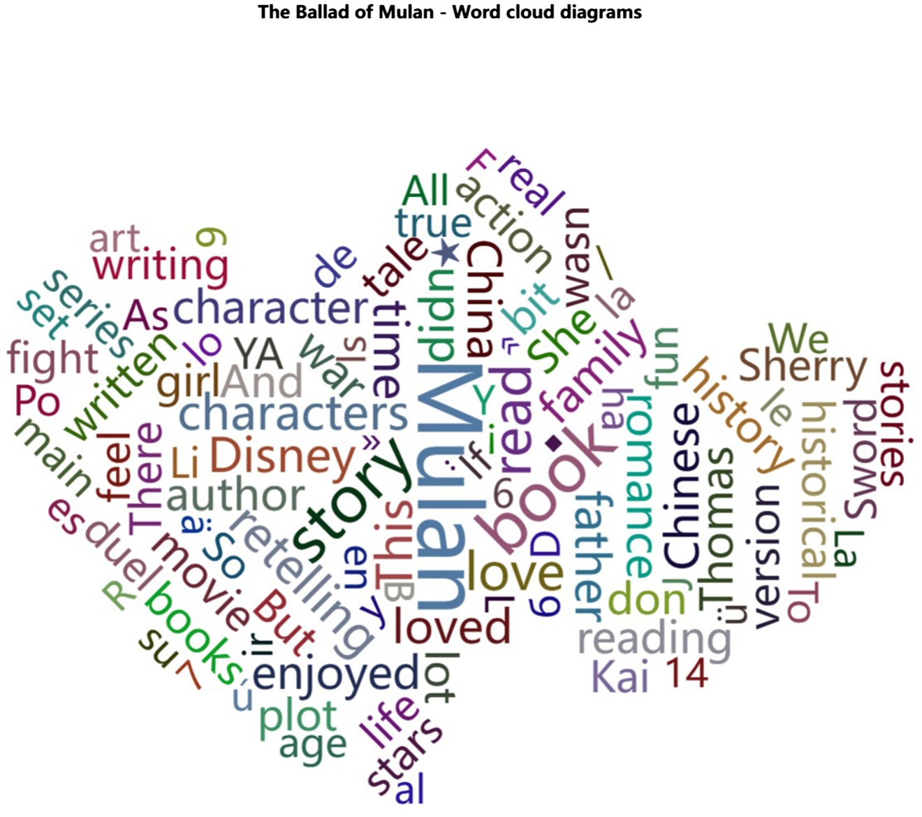 词云图反映了人们在讨论《木兰辞》时关注的重点内容。“Mulan”作为核心主题,自然是讨论的焦点。“Story”和“book”表明人们关注的是《木兰辞》的故事本身以及它以书籍等形式呈现的内容。“China”体现了其文化背景和来源地的重要性。“characters”说明角色也是人们关注的一个方面,可能涉及对木兰等角色的分析和评价。“love”可能暗示了故事中包含的情感元素受到关注。“Disney”则可能反映了迪士尼版本的《花木兰》对人们认知的影响,说明该版本在传播和影响方面具有一定的影响力。