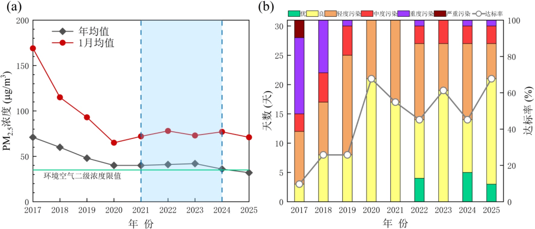 Figure 2. (a) Annual and January monthly average PM2.5 mass concentrations in Jiajiang County from 2017 to 2025; (b) Air quality grade status in January
