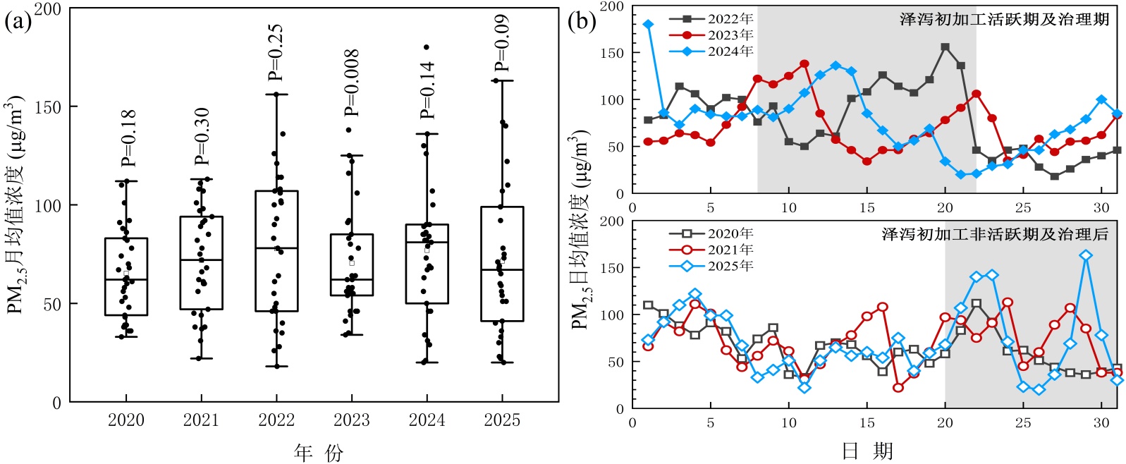 Figure 3. Characteristics of (a) monthly and (b) daily average PM2.5 mass concentrations of Jiajiang County in January 2020~2025