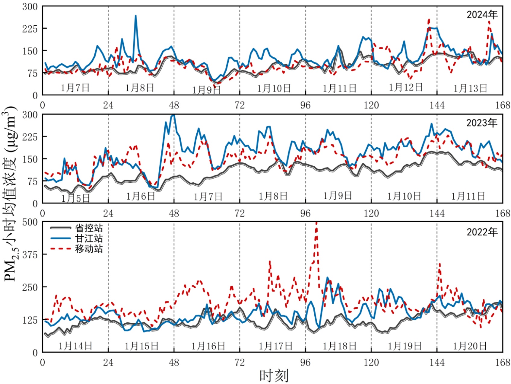 图4. 2022~2024年泽泻初加工期间夹江县不同监测站点PM2.5浓度小时变化序列
