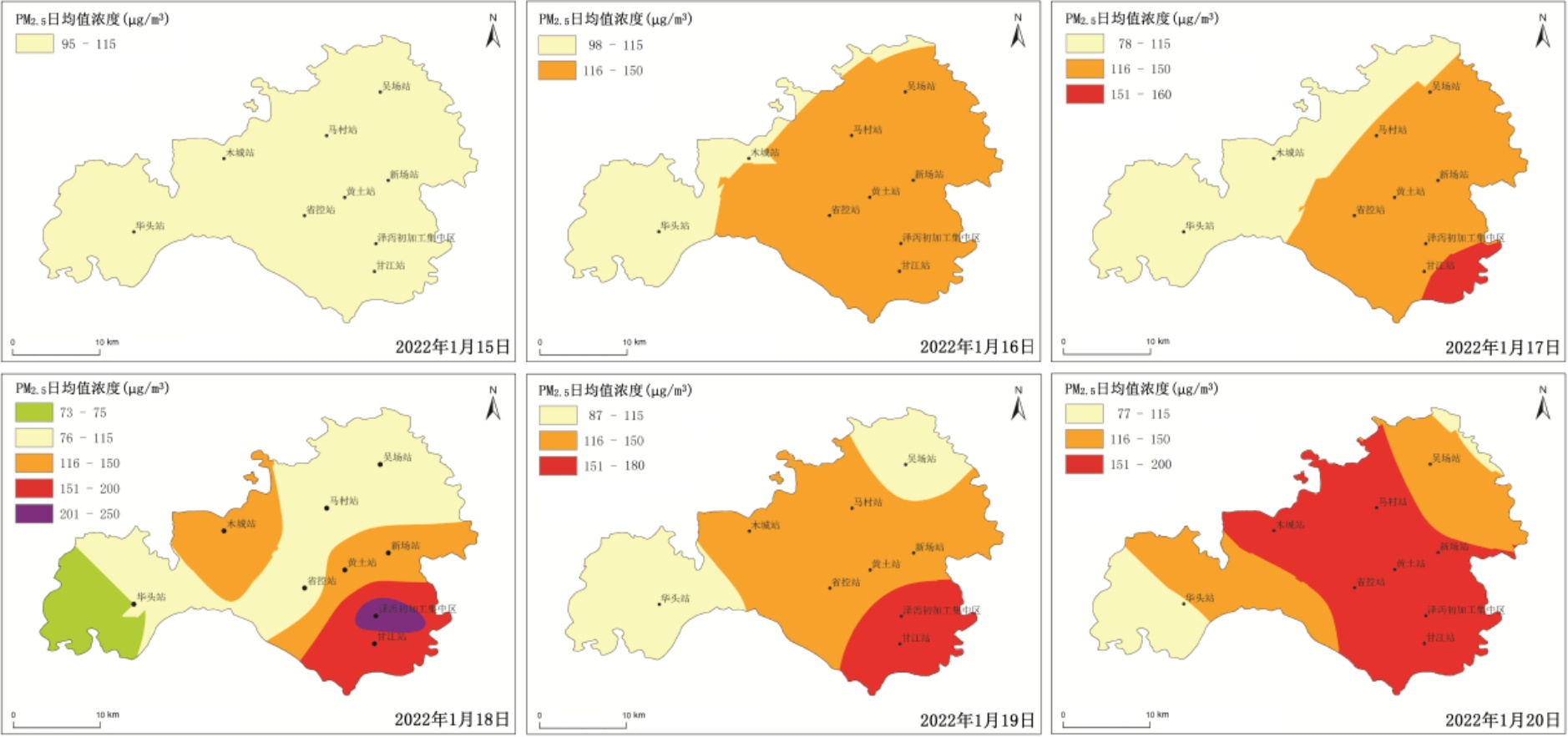 Figure 5. Spatial distribution of PM2.5 in Jiajiang County, January 15~20, 2022