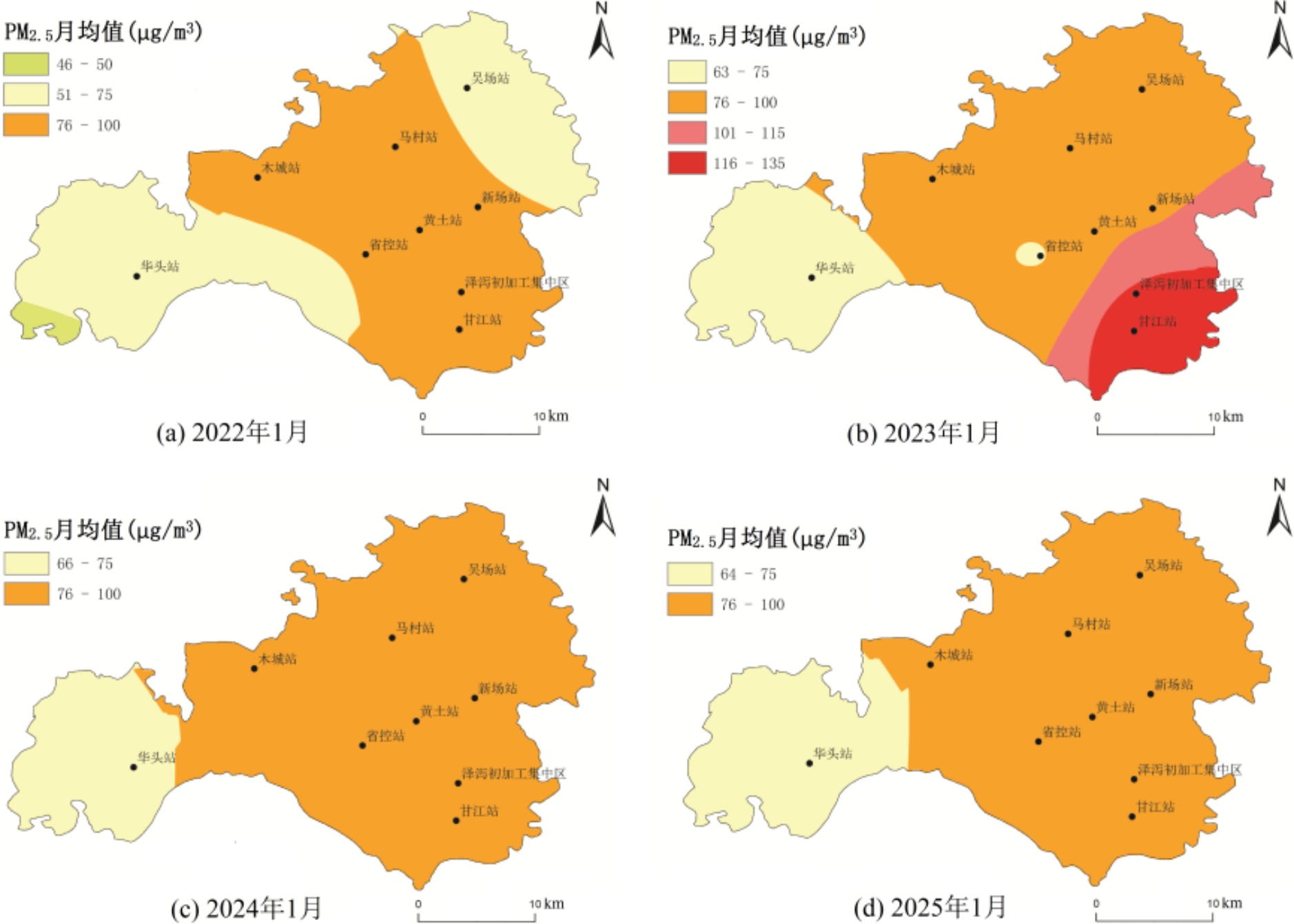 Figure 6. Spatial distribution of PM2.5 in Jiajiang County, January, 2022~2025
