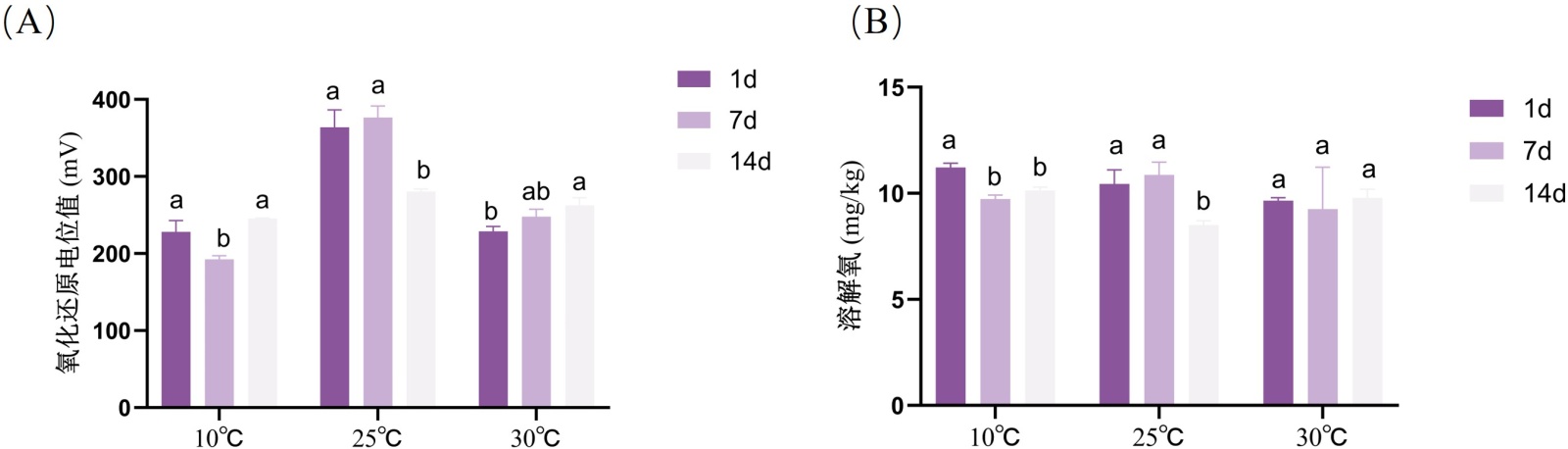 图2. 各温度下上覆水(A)氧化还原电位和(B)溶解氧的变化