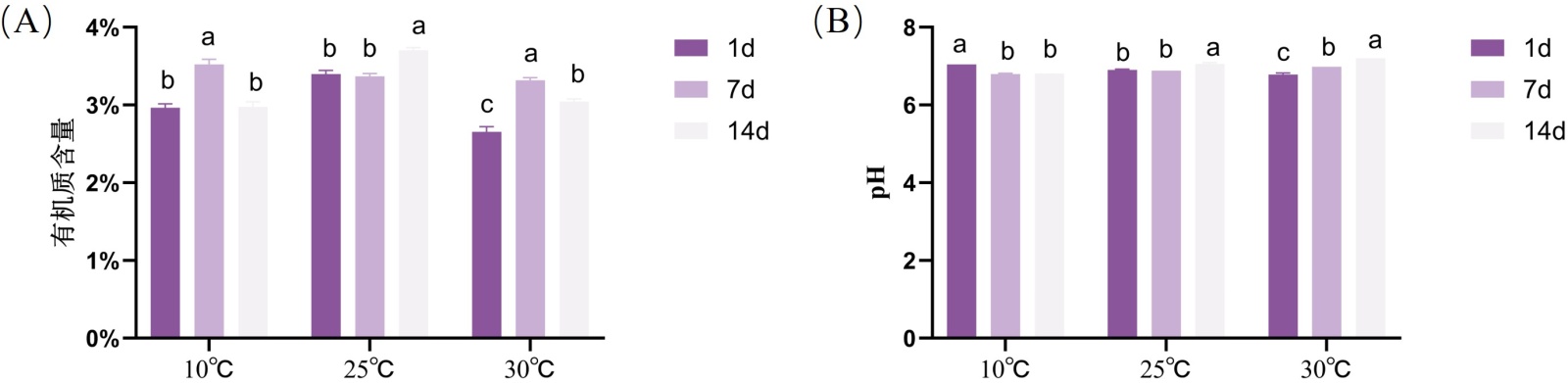 实验表明,10℃环境下,沉积物有机质含量在第7天达到最高值,并显著高于第1天和第14天,25℃环境下沉积物有机质在第14天达到最高值;30℃下沉积物有机质在第7天显著高于第14天和第1天,可能与微生物活动加剧导致有机质积累或转化有关(图3(A));沉积物pH值在10℃下随时间显著降低,从7.04下降到6.81,在25℃和30℃下,沉积物pH值随时间显著升高,分别由6.91升高到7.06和6.79升高到7.2 (图3(B))。