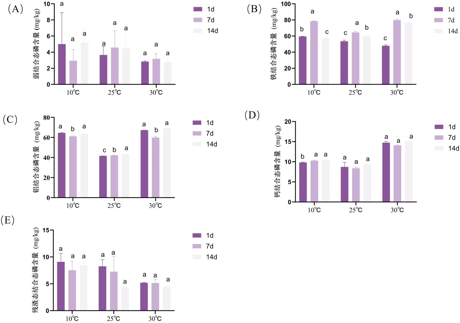 图4. 温度对沉积物弱结合态磷(A) 铁结合态磷;(B) 铝结合态磷;(C) 钙结合态磷;(D) 和残渣态磷;(E) 的影响