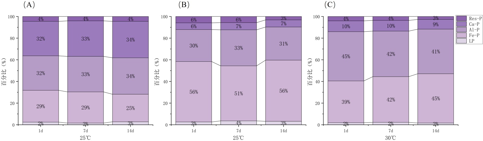 图5. 各温度下沉积物中不同形态磷百分比图(A) 25℃;(B) 25℃;(C) 30℃