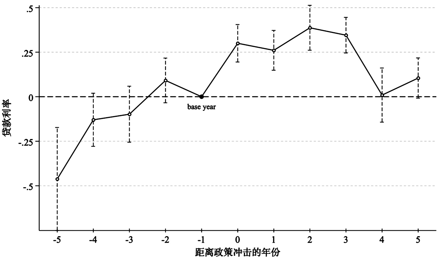 为了检验上述双重差分模型的有效性,本文进一步采用事件研究法对资管新规的实施效应进行动态考察。图2展示了政策冲击前后不同时点中小企业与大型企业在贷款利率上的差异情况。可以看到,在政策冲击前处理组与对照组的贷款利率变化趋势基本一致,无法拒绝不为零的假设,满足双重差分模型的平行趋势条件。而在政策发生当期及之后,交乘项系数整体转为正值,并在多个年份达到统计显著水平,表明资管新规颁布后,中小企业的贷款利率显著上升。这一结果与基准回归结论相一致。结合平行趋势检验的结果,可以认为本文的识别策略稳健有效,政策冲击所捕捉到的确实是资管新规引致的银行体系融资环境变化效应,而非其他宏观或行业层面共同因素所致。